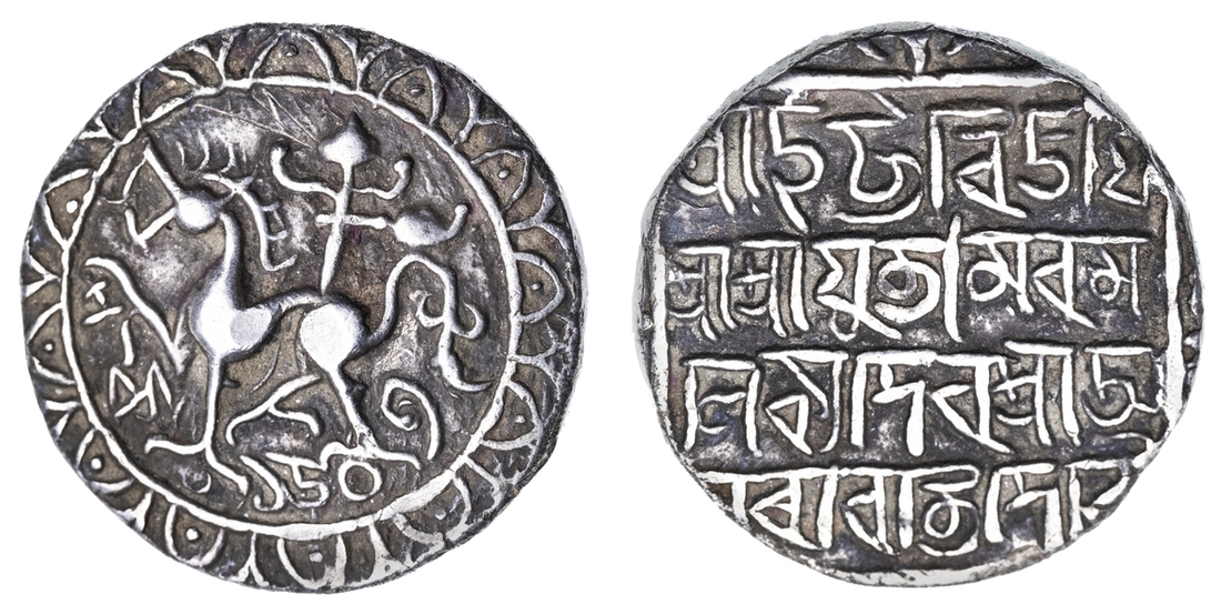 India, Princely States, Tripura, Amara Manikya (1577-1586), Tanka, 10.64g, Sk.1503, citing Queen Amaravati, commemorating the conquest of Sylhet, lion facing left, with standard type 'm', rev. Srihatte Vijayi/ Sri Sri Yutamara Ma/nikya Deva Sri A/maravati Devyau in square (RB. 169; KM. 92), attractively toned, good very fine, scarce