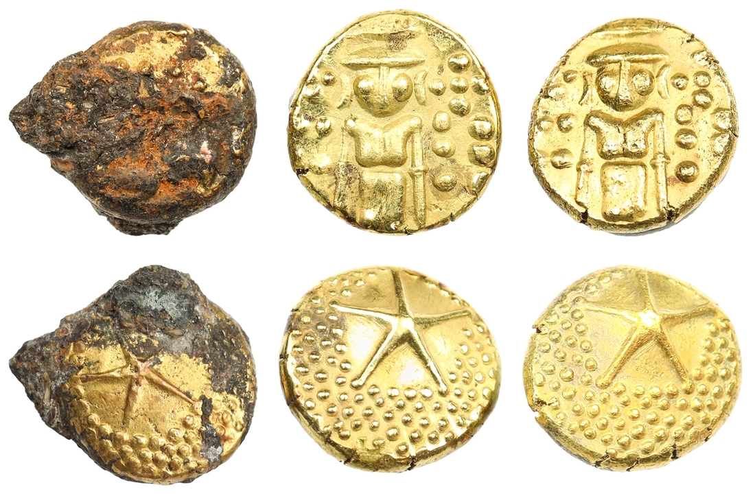 India, East India Company, Madras Presidency (c. 1740-1806), gold Star Pagoda (3), single half-length deity, rev. star on granulated surface, 3.22g; 3.40g; 3.55g (Mitchiner, Southern India, part 2, 1272; Pridmore 9; KM 303), all with usual striking splits to edge, the first two with lustre, extremely fine, the last with copper deposits from ship wreck, obverse mostly obscured, reverse better, fine / very fine