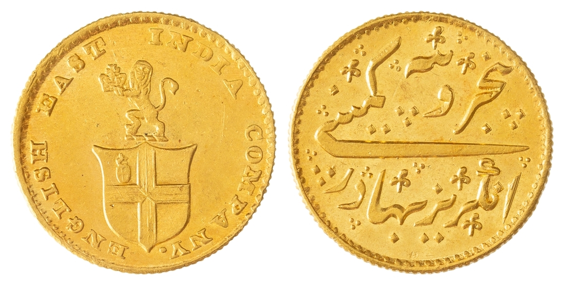 (g) India, East India Company, Madras Presidency, Five-Rupees or Third-Mohur, (1819), arms of East India Company, rev. legend, edge milled, 3.89g, 12h (Stevens 4.7; Prid. 244; KM 422), some softness to the rims and light contact marking, otherwise lustrous, bold very fine