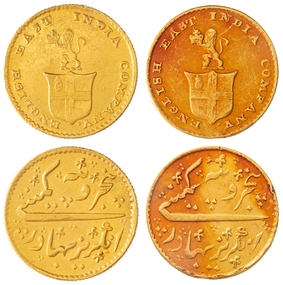 (g) India, East India Company, Madras Presidency, Five-Rupees or Third-Mohur, (1819), arms of East India Company, rev. legend, edge milled, 3.87g, 12h (Stevens 4.7; Prid. 244; KM 422), water worn and bruising to the edge, with a rich ochre-rusted tone, near very fine; and, Five-Rupees or Third-Mohur, (1819), arms of East India Company, rev. legend, edge milled, 3.90g, 12h (Stevens 4.7; Prid. 244; KM 422), some bruising to edge, light contact marking, with lustre, very fine (2)