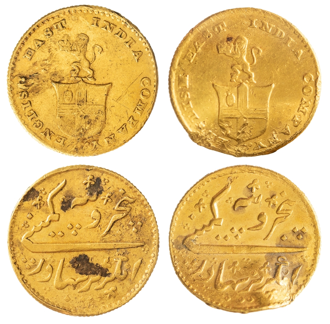 (g) India, East India Company, Madras Presidency, Five-Rupees or Third-Mohur, (1819), arms of East India Company, rev. legend, edge milled, 3.85g, 12h (Stevens 4.7; Prid. 244; KM 422), tooled to edge and obverse, with lightly water worn surfaces, strict very fine; and, Five-Rupees or Third-Mohur, (1819), arms of East India Company, rev. legend, edge milled, 3.85g, 12h (Stevens 4.7; Prid. 244; KM 422), tooled to edge and bent, with lustre, struck details about very fine (2)