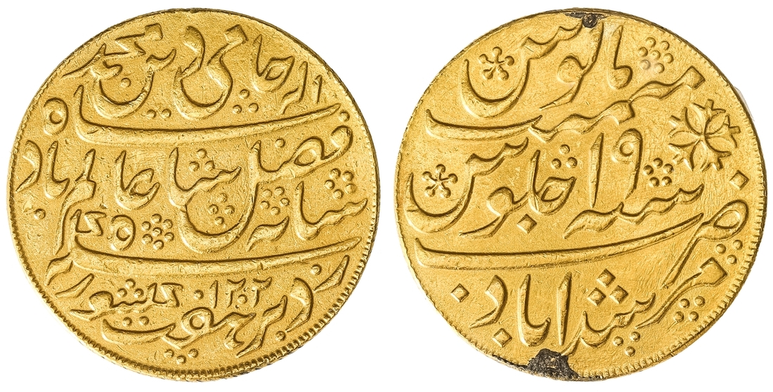 (x) India, East India Company, Bengal Presidency, Shah Alam II (1759-1806), gold Mohur, AH1202/19, Murshidabad (Calcutta), obliquely milled edge, 11.21g, 1h (Pr. 71; Stevens 5.2), cleaned and previously mounted, struck details better, about very fine, with NGC Certification ~ Altered Surface (Cert. #8222339-008) [Not Encapsulated]