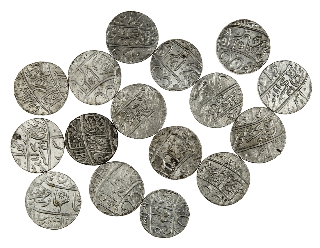India, East India Company, Bengal Presidency, Rupee, in the name of Shal Alam II Badshah, Muhammadabad Banaras (Lucknow), AH 1229/17-49 (1813) (15), (Prid. 286; KM 41), some with dates partially off-flan, three wiped and with test marks to the edge, otherwise mostly with a pleasing mint lustre, very fine to uncirculated (16)
