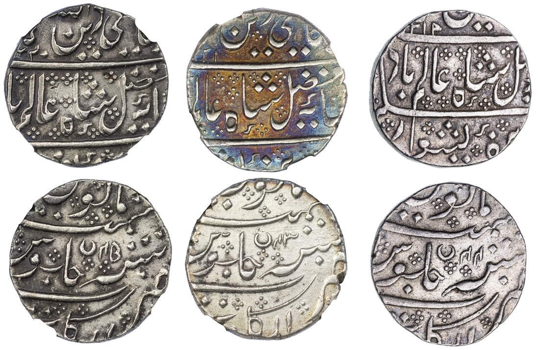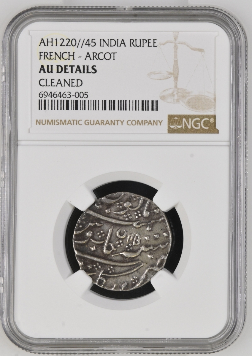 NGC AU | French India, in the name of Shah 'Alam II Arcot Rupee, 11.40g, Arkat, AH(12)22 / 45, crescent by regnal year (KM 15), cleaned very fine, in NGC holder, graded NGC AU Details ~ Cleaned (Cert. #6946463-005), NGC AU | French India, a similar Arcot Rupee, 11.33g, Arkat, AH(12)21 / 43, crescent by regnal year (KM 15), iridescent obverse toning, very fine, in NGC holder, graded NGC AU Details ~ Cleaned (Cert. #6946463-006); another Rupee, similar, AH1218 / 44 (KM 15), toned, good very fine (3)