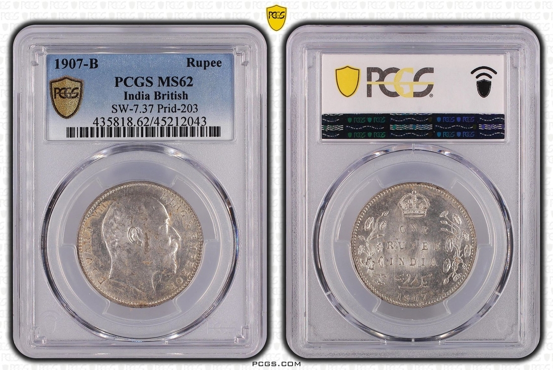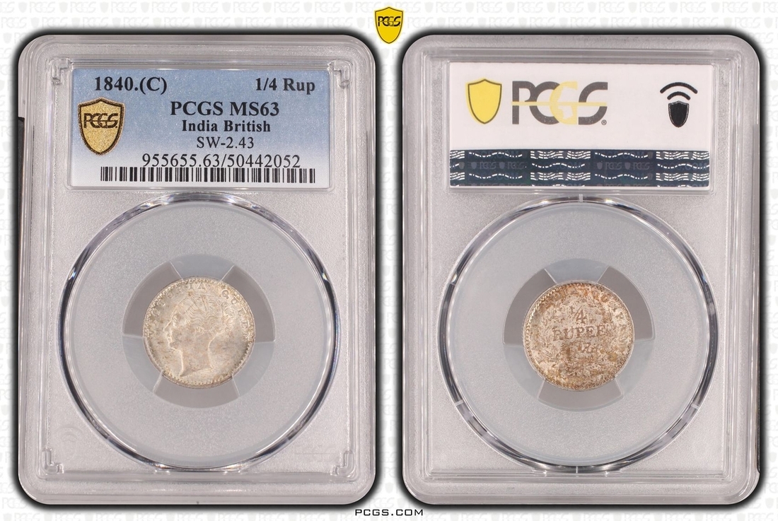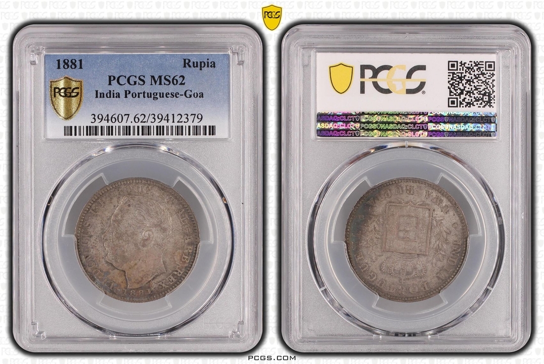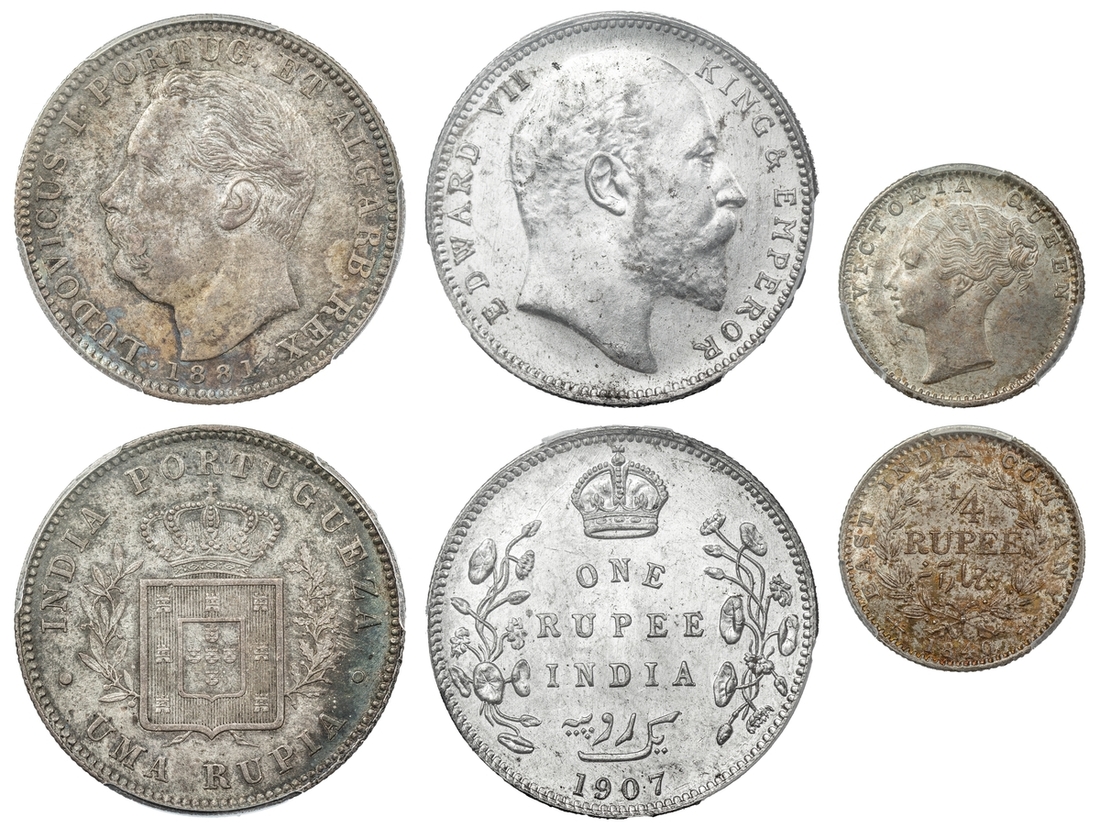 (x) PCGS MS63 | India, Victoria (1837-1901), Quarter-Rupee, 1840 C, Calcutta, stop after date, edge milled, 12h (SW 2.43; KM 454), some light contact marks before face, with a pleasing mint lustre and toned, extremely fine, in PCGS holder, graded MS63 (Cert. #50442052); PCGS MS62 | India, Edward VII (1901-1910), Rupee, 1907 B, Bombay, edge milled, 12h (SW. 7.37; Prid. 203; KM 508), some faint friction marks to otherwise mint lustrous surfaces, good extremely fine, in PCGS holder, graded MS62 (Cert. #45212043); PCGS MS62 | Portuguese India, Goa, Luís I (1861-1889), Rupia, 1881, edge milled, 6h (KM 312), with a dark cabinet tone, extremely fine, in PCGS holder, graded MS62 (Cert. #39412379) (3)