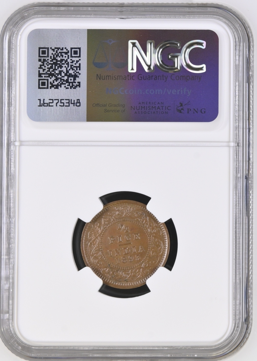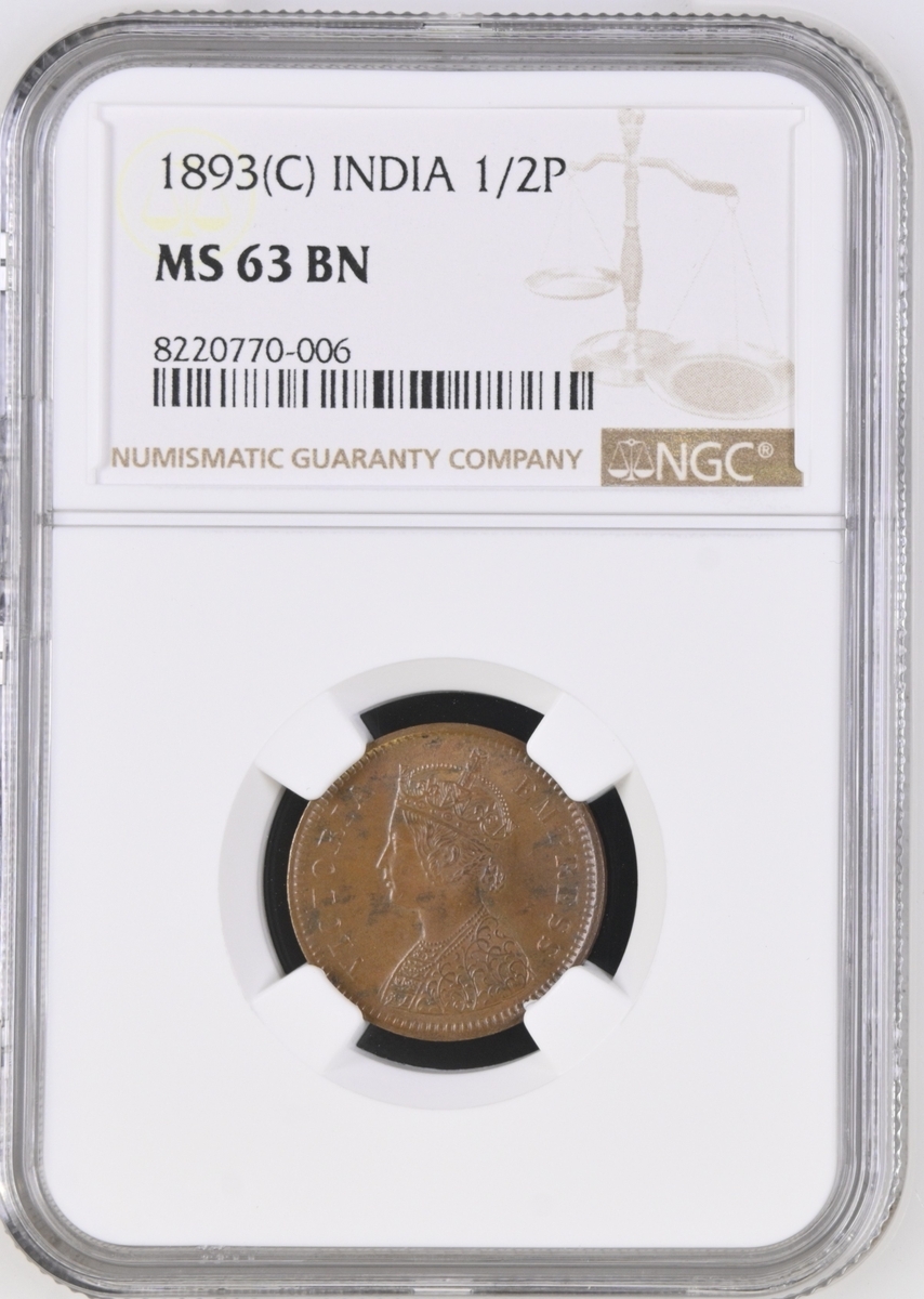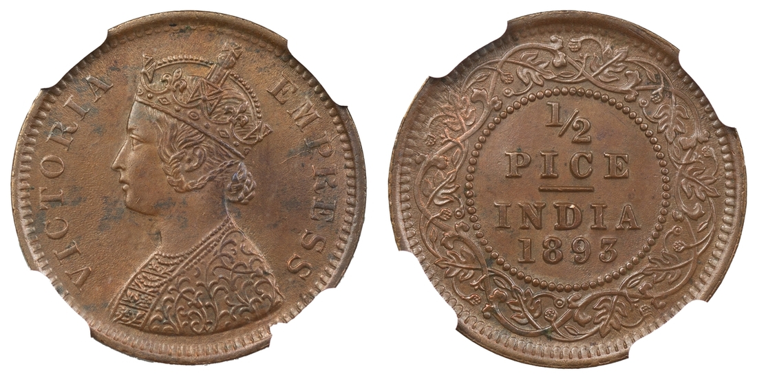 NGC MS63 BN | India, Victoria (1837-1901), Half-Pice, 1893, Calcutta, crowned and draped bust left, rev. value and date within border, edge plain, 11h (KM 484), some darker toning to spots to otherwise chocolate brown surfaces, about extremely fine, in NGC holder, graded MS63 BN (Cert# 8220770-006)