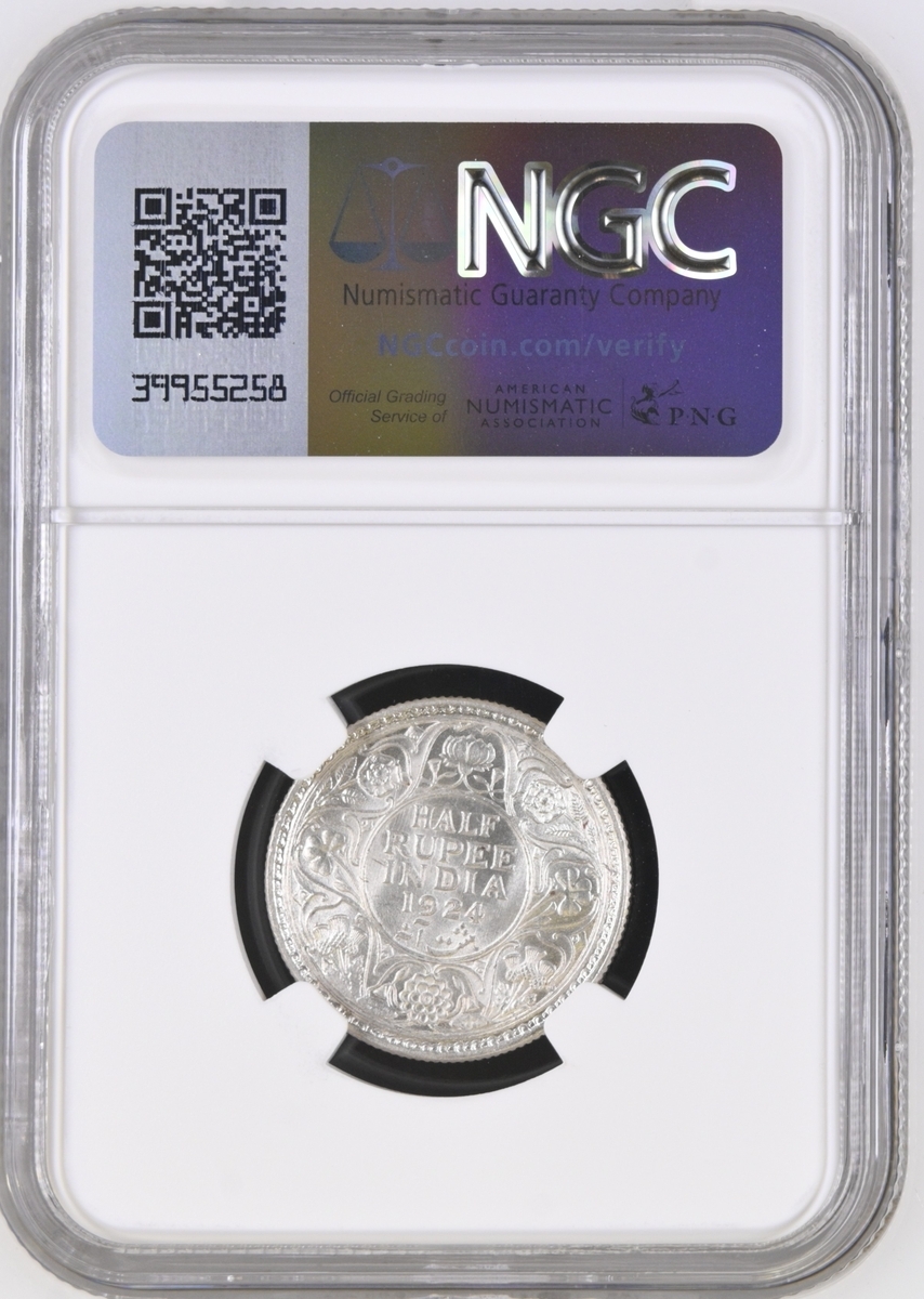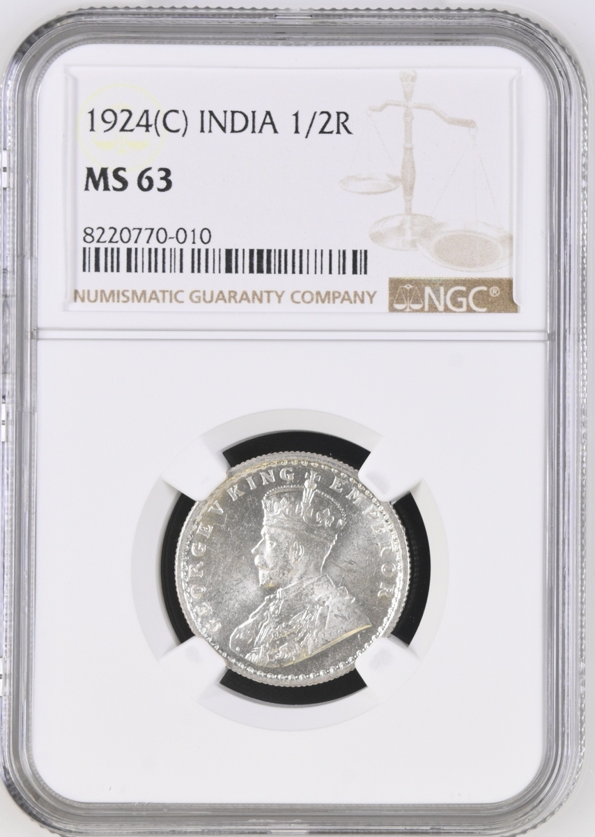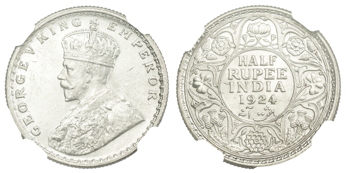 NGC MS63 | India, George V (1910-1936), Half-Rupee, 1924, Calcutta, crowned and draped bust left, rev. value and date within wreath, edge milled, 12h (KM 522), light scattering of friction marks, with a handsome cartwheel mint bloom, good extremely fine, in NGC holder, graded MS63 (Cert. #8220770-010)