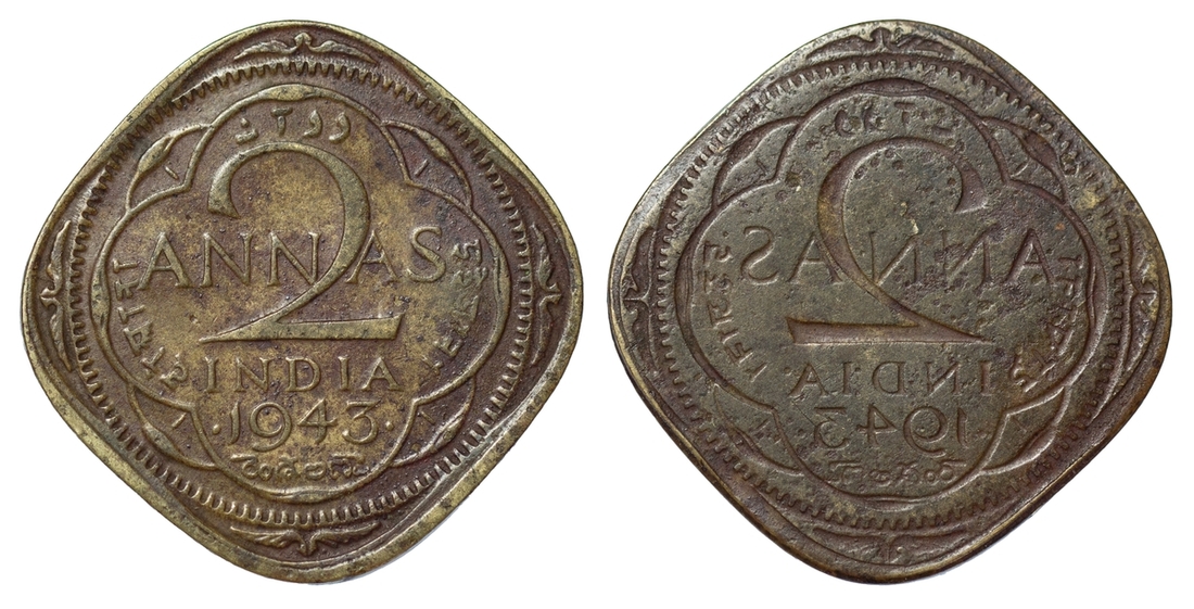 India, George VI (1936-1952), Brockage Two-Annas, 1943, value and date within border, edge plain, 5.79g (KM 541a), a full reverse brockage, very fine and scarce