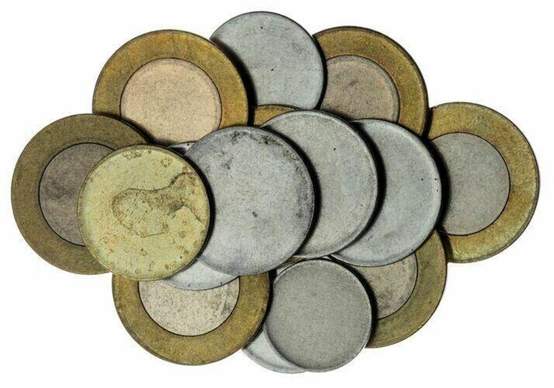 India, Republic, Blank Coin Dies (18), from early 21st century issues, in a variety of metals including bi-metallic types (7), single metal types in unblemished condition or with minor bag marks, the bi-metallic issues with signs of circulation (18)