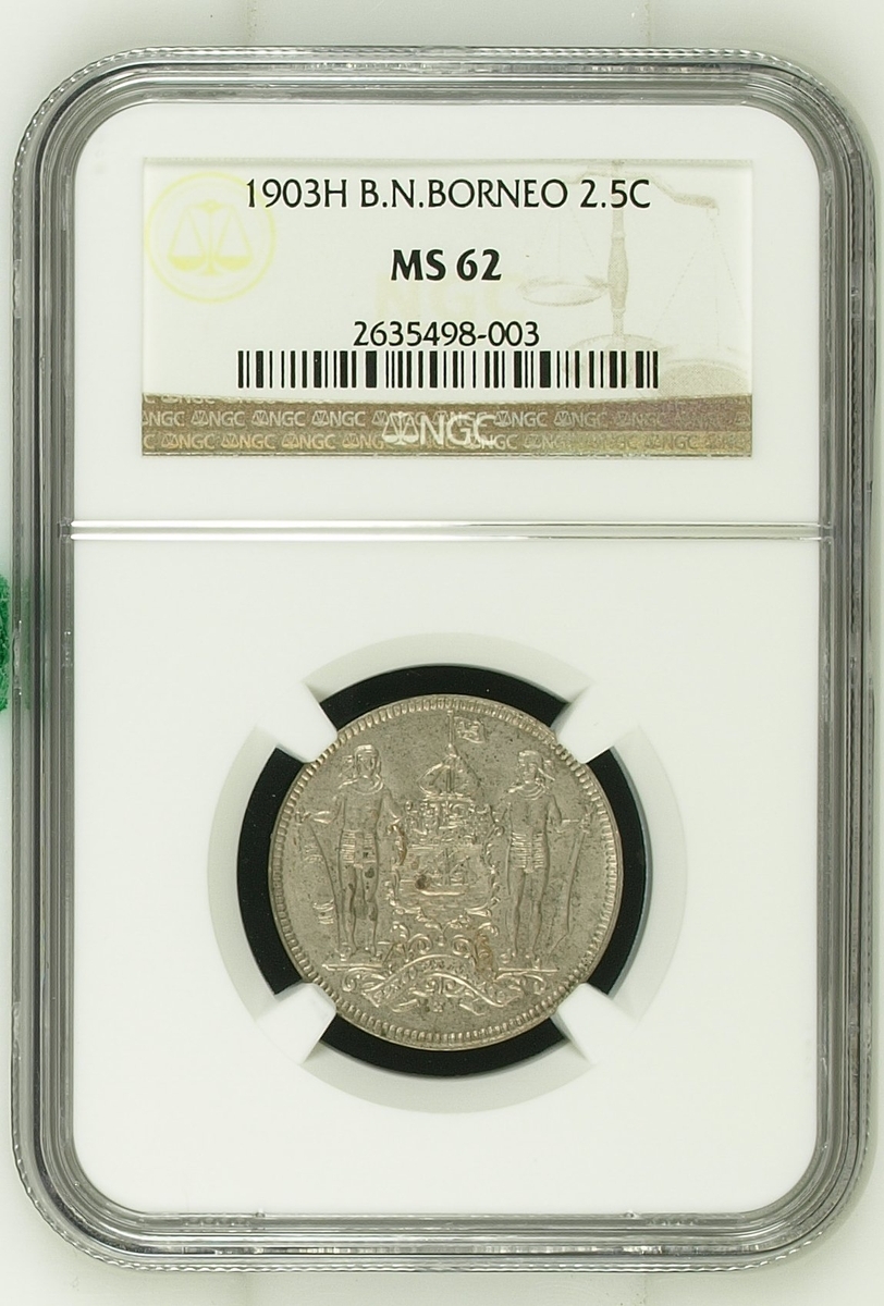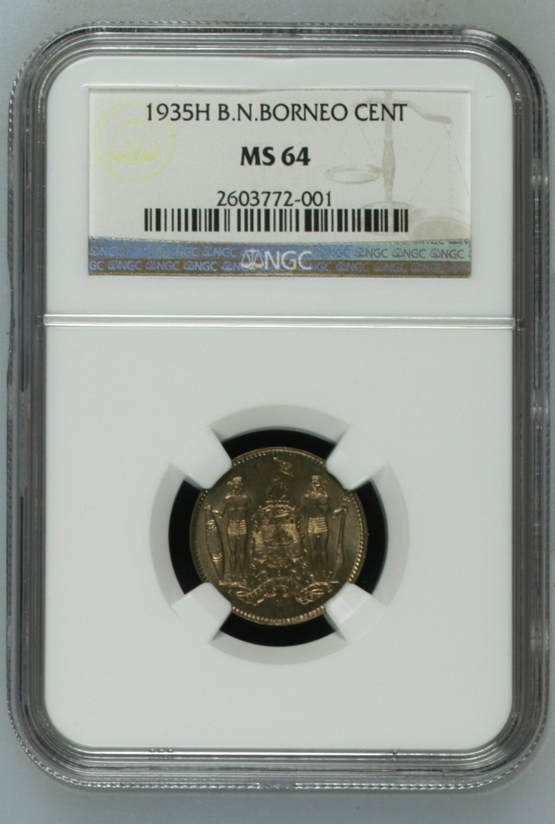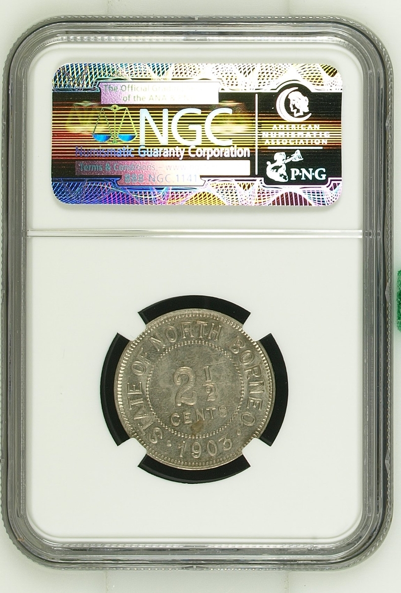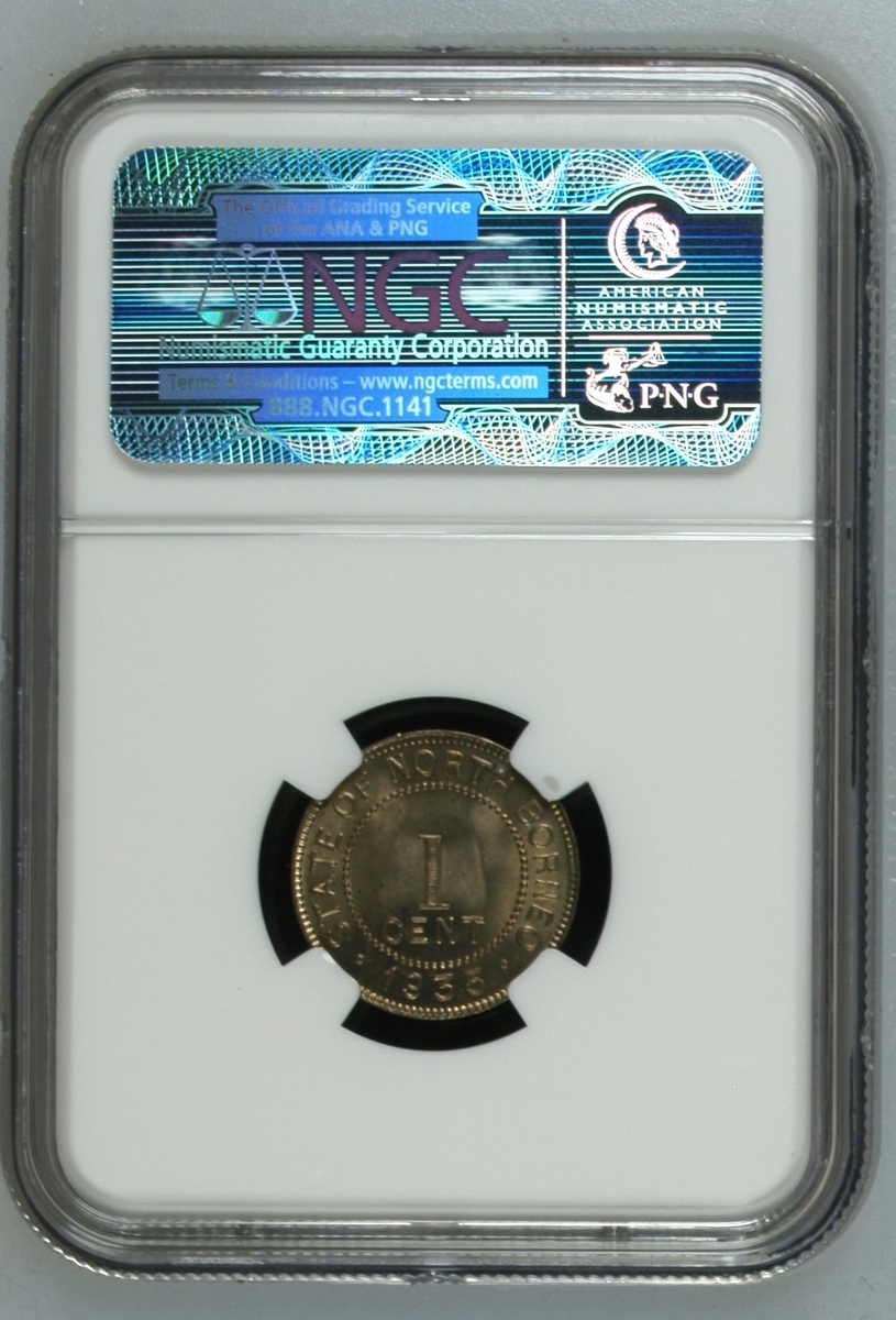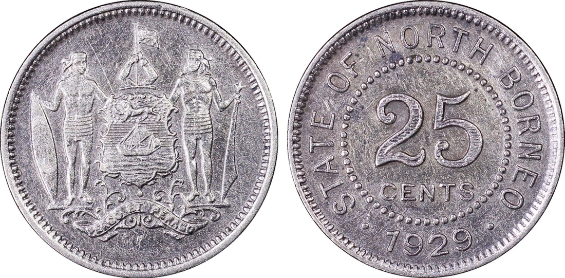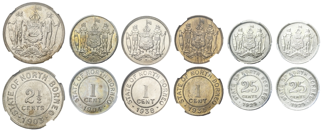 PCGS AU | British North Borneo, 25 Cents, 1929 H, edge milled, 12h (KM 6), cleaned, very fine, in PCGS holder, graded AU DETAILS ~ Cleaning (Cert. #28071820); NGC MS62 | Two and Half Cents, 1930 H, edge milled, 11h (KM 4), couple of contact marks, otherwise with a pleasing lustre, extremely fine, in NGC holder, graded MS62 (Cert.#2635498-003); Cent, 1904 H, edge plain, 11h (KM 3), light scattering of contact marks, toned, extremely fine, in 'ICG' holder, graded MS63 (Cert. #7371370501); another, NGC MS64 | Cent, 1935 H, edge plain, 12h (KM 3), lustrous, good extremely fine, in NGC holder, graded MS64 (Cert. #2603772-001); another, NGC MS67 | 1938 H, edge plain, 12h (KM 3), much as struck, in NGC holder, graded MS67 (Cert. #1880361-021); another, NGC MS63 | 1938 H, edge plain, 12h (KM 3), much as struck, in NGC holder, graded MS63 (Cert. #2789378-003) (6)