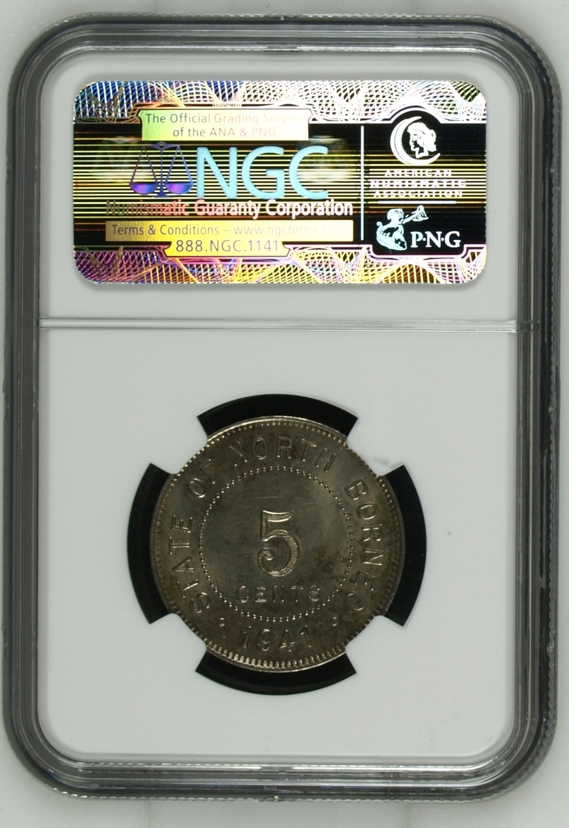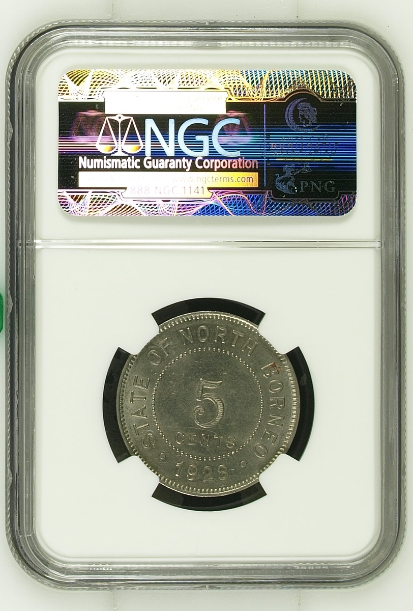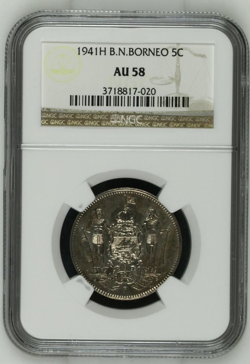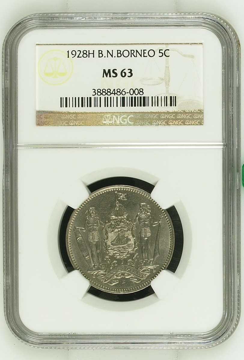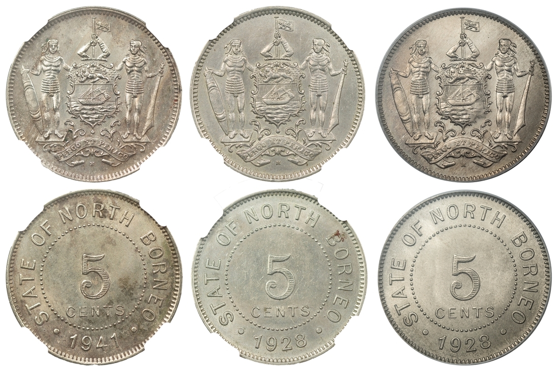 PCGS MS65 | British North Borneo, 5 Cents, 1928 H, arms, rev. value, edge plain, 12h (KM 5), with a full mint lustre, good extremely fine, in PCGS holder, graded MS65 (Cert. #13212803); NGC MS63 | 5 Cents, 1928 H, arms, rev. value, edge plain, 12h (KM 5), some minor surface marking, with a pleasing lustre, extremely fine, in NGC holder, graded MS63 (Cert. #3888486-008); NGC AU58 | 5 Cents, 1928 H, arms, rev. value, edge plain, 12h (KM 5), some minor contact marks and with an irregular patchy tone, good very fine, in NGC holder, graded AU58 (Cert. #3718817-020) (3)