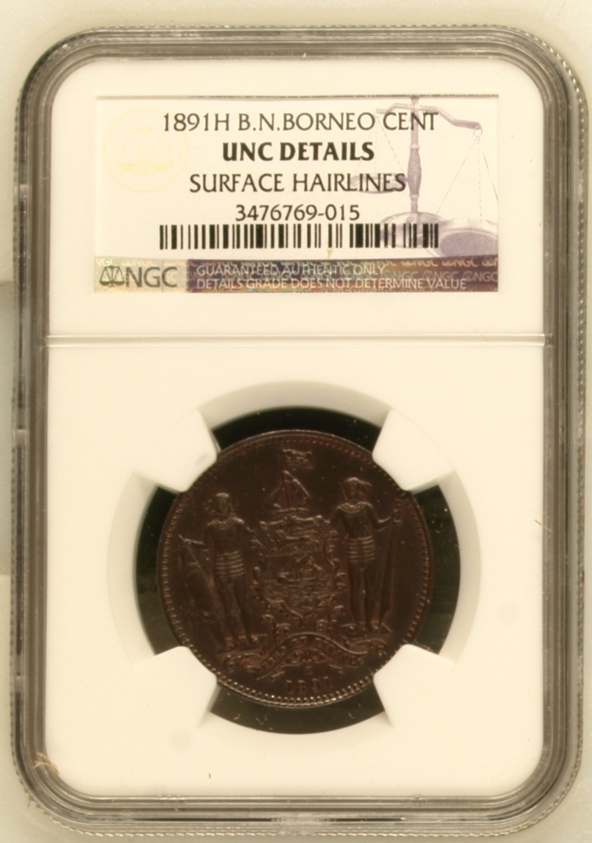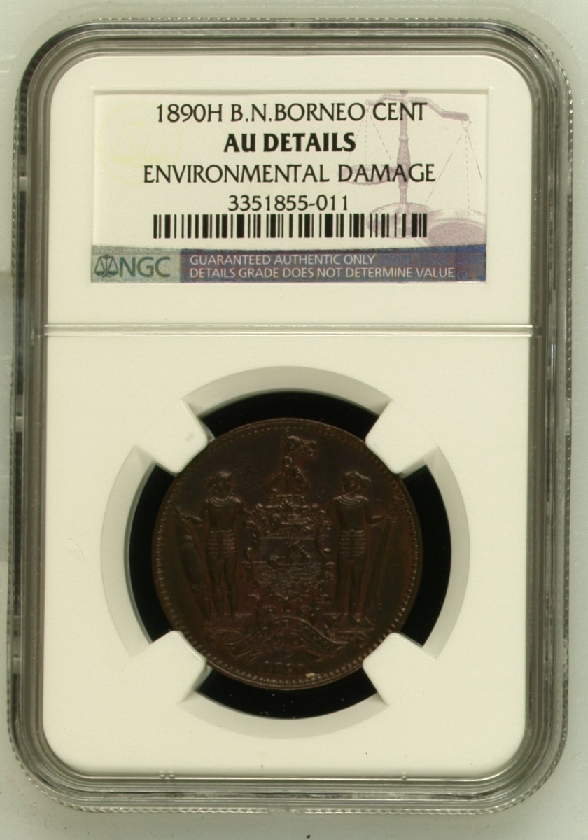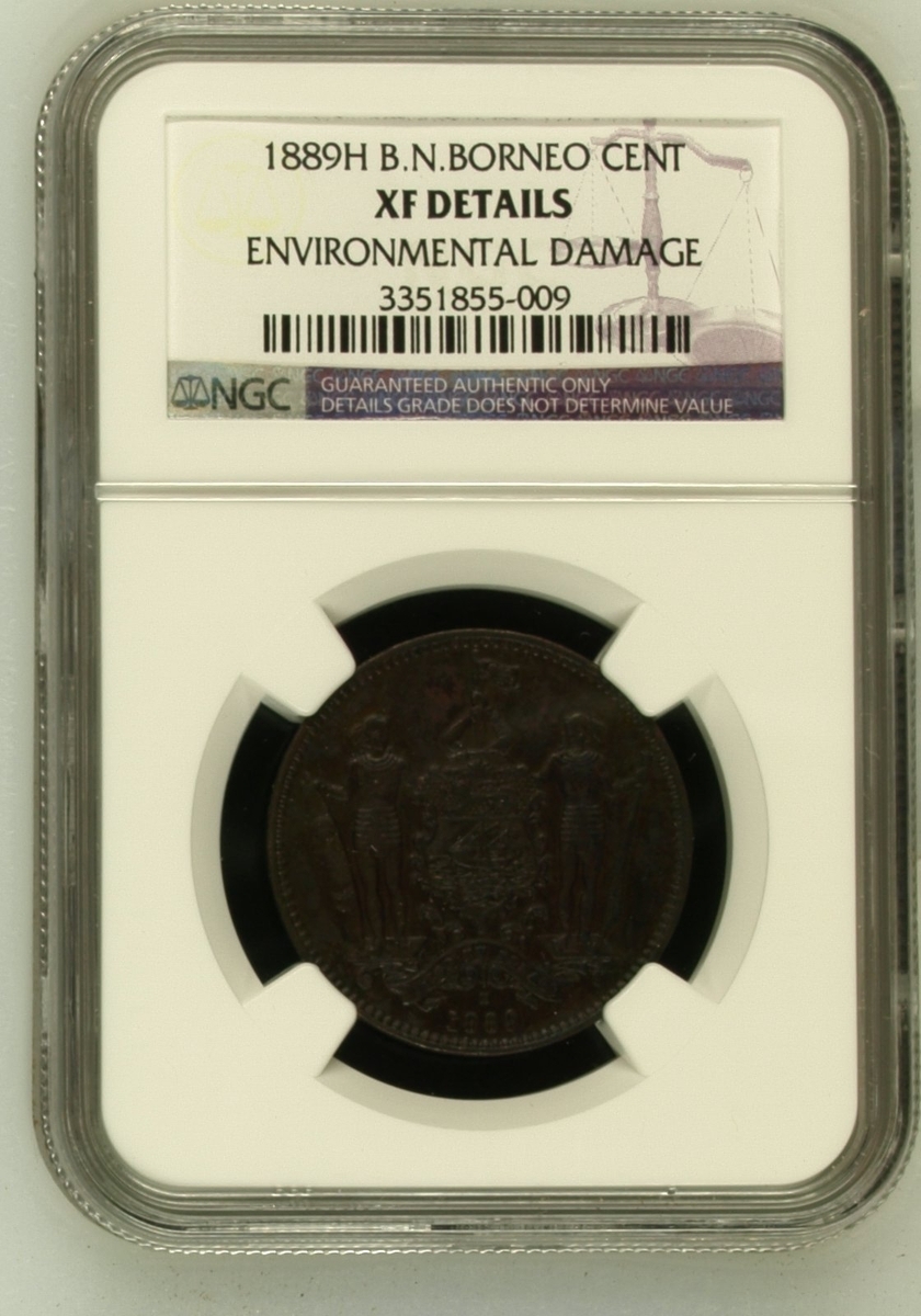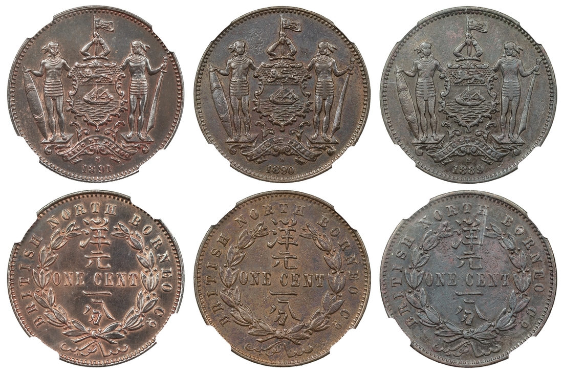 NGC XF | British North Borneo, Cent, 1889 H, arms, rev. value in wreath, edge plain, 12h (KM 2), slight pitting in areas of reverse, with dark brown surfaces, very fine, in NGC holder, graded XF DETAILS ~ Environmental Damage (Cert. #3351855-009); NGC AU | Cent, 1890 H, arms, rev. value in wreath, edge plain, 12h (KM 2), contact marked and with areas of pitting, very fine, in NGC holder, graded AU DETAILS ~ Environmental Damage (Cert. #3351855-011); NGC UNC | Cent, 1891 H, arms, rev. value in wreath, edge plain, 12h (KM 2), wiped and with hairlines, hints of red to edges of devices, very fine, in NGC holder, graded UNC DETAILS ~ Surface Hairlines (Cert. #3476769-015) (3)