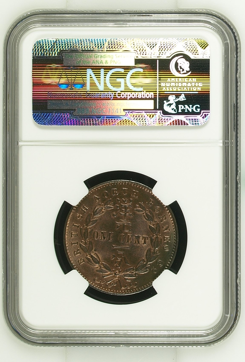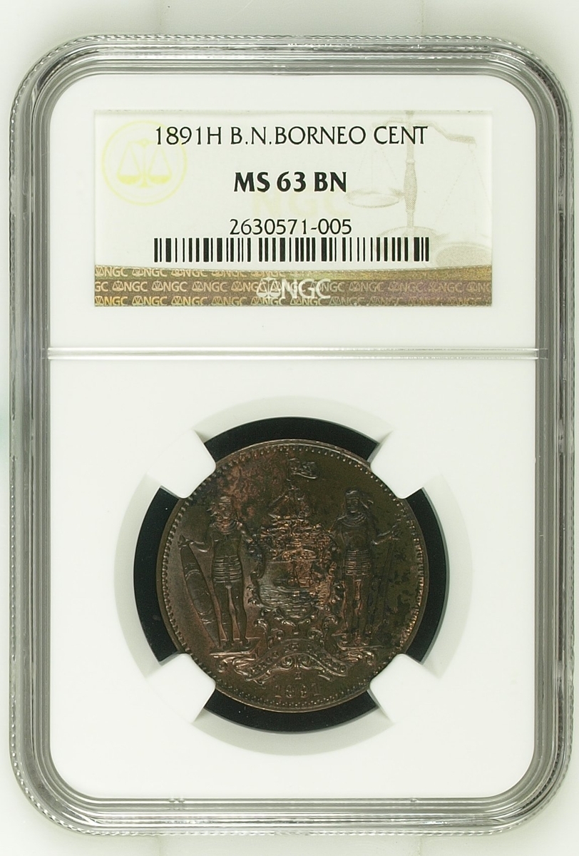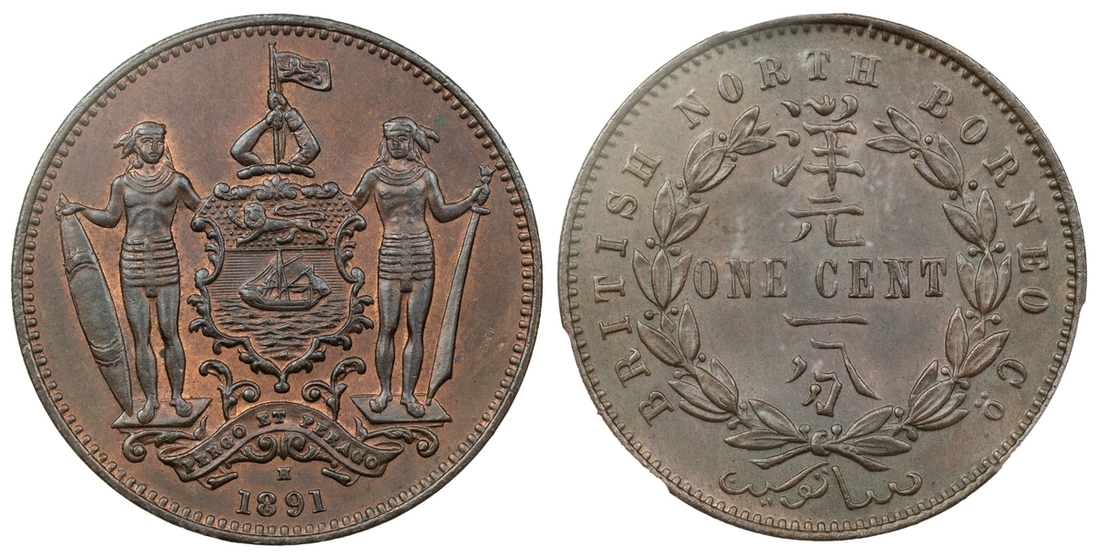 PCGS MS64 BN | British North Borneo, Cent, 1891 H, arms, rev. value in wreath, edge plain, 12h (KM 2), with a handsome red hue to otherwise brown surfaces, pleasing extremely fine, in PCGS holder, graded MS64 BN (Cert. #29833409); NGC MS63 BN | Cent, 1891 H, arms, rev. value in wreath, edge plain, 12h (KM 2), with areas of speckled toning, otherwise with hints of pleasing mint red to brown-lustrous surfaces, good extremely fine, in NGC holder, graded MS63 BN (Cert. #2630571-005) (2)