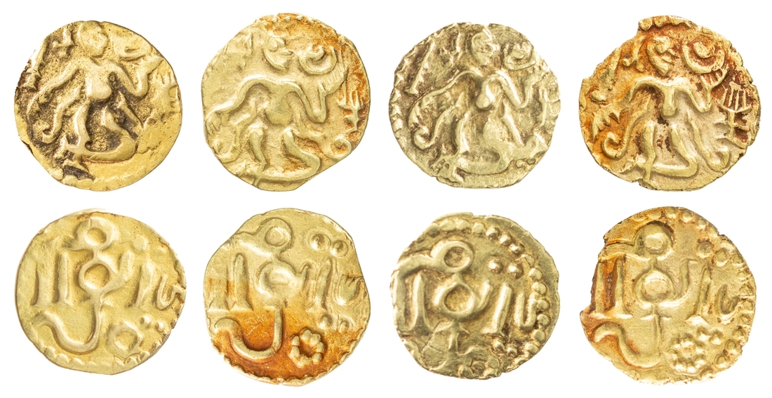 (x) Sri Lanka (Ceylon), Anonymous (c.960-1214), Type II(2), gold Pala (Quarter-Kahavanu) (4), standing figure holding an adahanda, rev. legend a stylised form of Lakshmi in Devanagiri, lotus over La, 1.02g; 1.03g; 0.94g; 0.78g, (Codrington 57; Mitchiner, Southern India, part 2, 314), fine to very fine (4)