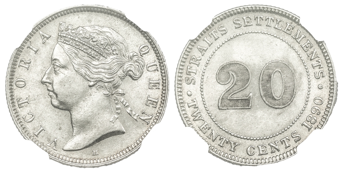 NGC MS62 | Straits Settlements, Victoria (1837-1901), 20 Cents, 1890 H, crowned bust left, rev. value, edge milled, 6h (KM 12), some minor surface friction, otherwise with a pleasing cartwheel lustre, about uncirculated, in NGC holder, graded MS62 (Cert. #3501539-034)