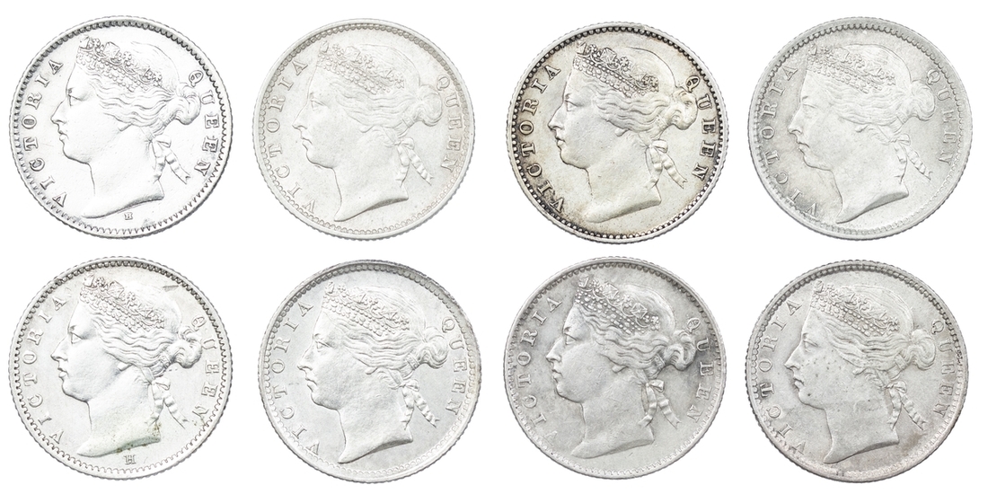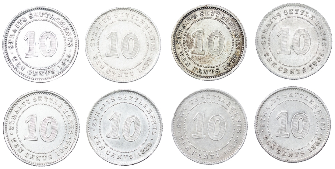 Straits Settlements, Victoria (1837-1901), 10-Cents, 1878; 1879; 1882 H; 1884; 1885; 1888; 1889; 1901, edges milled (KM 11; Prid. 92; 93; 94; 85; 97; 110), with a verdigris tinge, some cleaned, ranging from very fine to uncirculated (8)