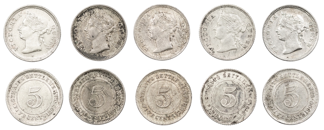 Straits Settlements, Victoria (1837-1901), 5-Cents, 1878; 1890 H; 1897; 1900 H; 1901, edges milled (KM 10; Prid. 127; 139; 145; 150; 151), some with verdigris to the edges, others with an irregular tone, lustrous, generally extremely fine (5)
