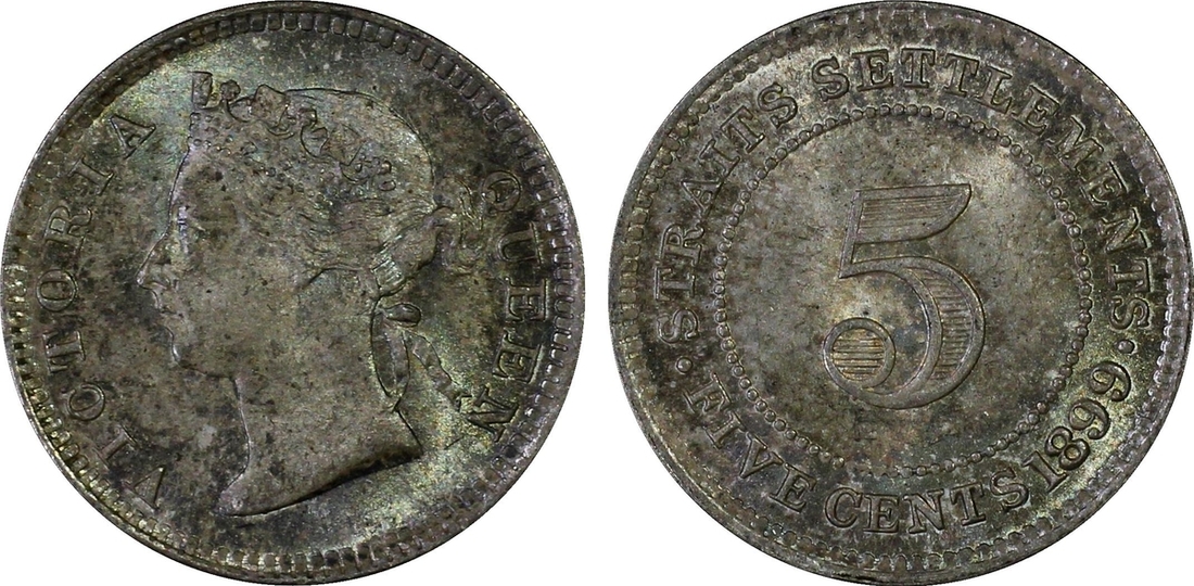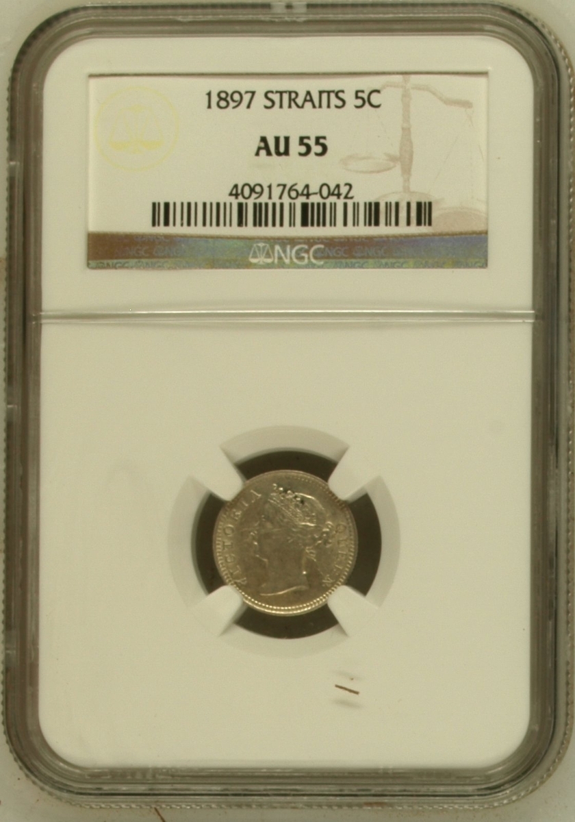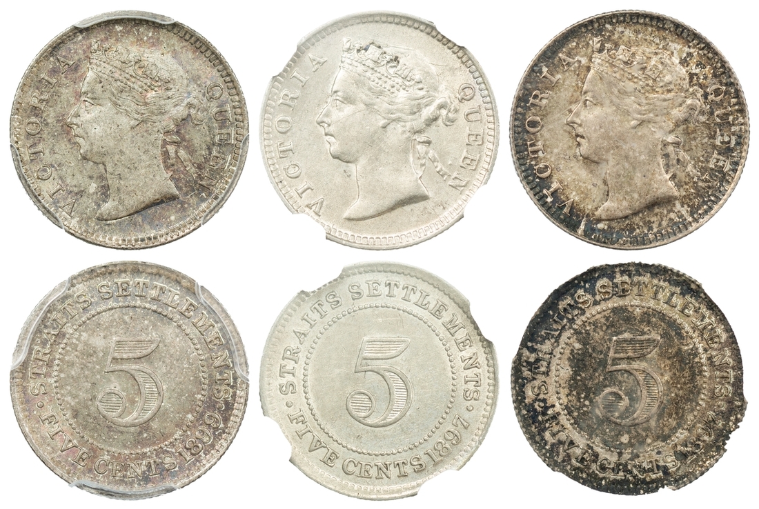 PCGS MS63 | Straits Settlements, Victoria (1837-1901), 5 Cents, 1897, crowned bust left, rev. value, edge milled, 6h (KM 10), with a dark speckled tone, about extremely fine, in NGC holder, graded MS63 (Cert. #19846085); NGC AU55 | 5 Cents, 1897, crowned bust left, rev. value, edge milled, 6h (KM 10), with hairlines and softness to the hair, yet with hints, very fine, in NGC holder, graded AU55 (Cert. #4091764-042); PCGS MS65 | 5 Cents, 1899, crowned bust left, rev. value, edge milled, 6h (KM 10), with a handsome lustre with speckled toning to surfaces, good extremely fine, a key date in series, in PCGS holder, graded MS65 (Cert. #29914497) (3)