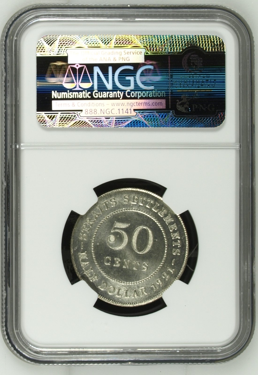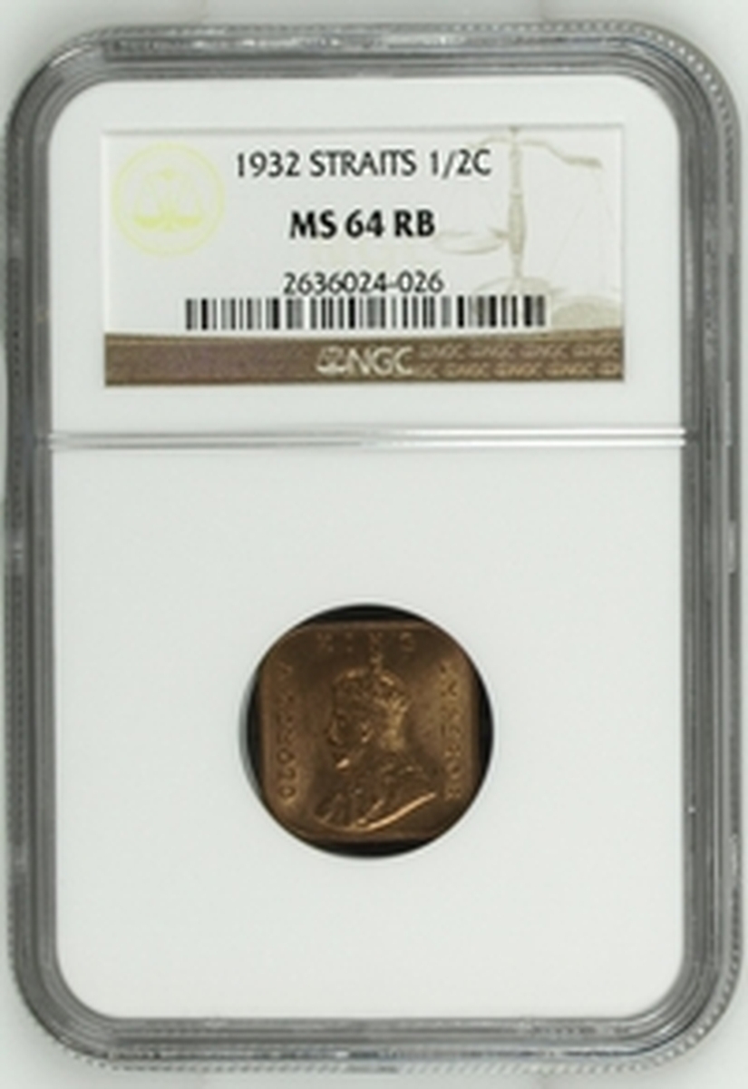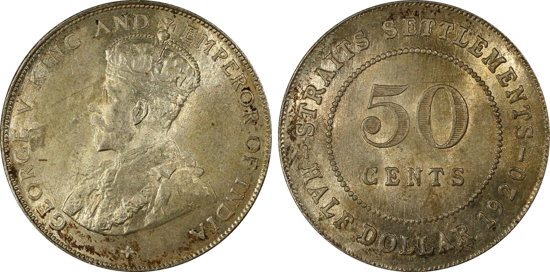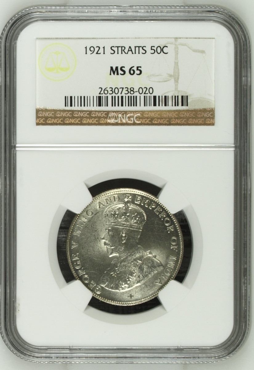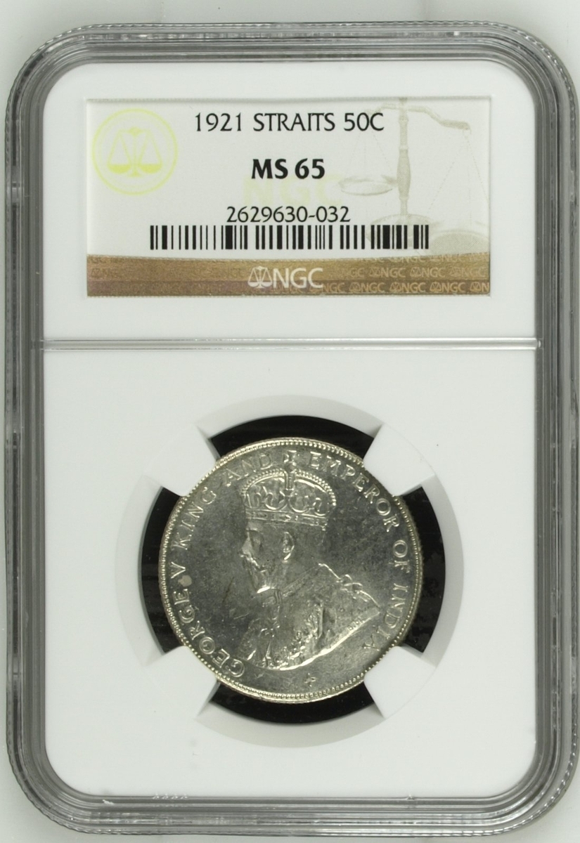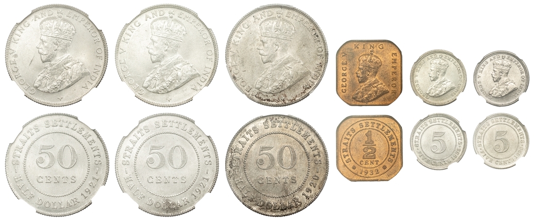 PCGS MS63 | Straits Settlements, George V (1910-1936), 50 Cents, 1920, without dot, crowned and draped bust left, rev. value, edge milled, 12h (KM 35.1), with irregular toning, otherwise with a pleasing lustre, extremely fine, in NGC holder, graded MS63 (Cert. #31061885); NGC MS65 | 50 Cents, 1921, crowned and draped bust left, rev. value, edge milled, 12h (KM 35.1), some wispy hairlines, otherwise with a pleasing cartwheel lustre, about uncirculated, in NGC holder, graded MS65 (Cert. #2629630-032); NGC MS65 | 50 Cents, 1921, crowned and draped bust left, rev. value, edge milled, 12h (KM 35.1), some wispy hairlines, otherwise with a pleasing cartwheel lustre, about uncirculated, in NGC holder, graded MS65 (Cert. #2630738-020); NGC MS65 | 5 Cents, 1926, crowned and draped bust left, rev. value, edge milled, 12h (KM 36), minor contact marks, with a pleasing lustre, extremely fine, in NGC holder, graded MS65 (Cert. #2629630-015); NGC MS62 | 5 Cents, 1935, crowned and draped bust left, rev. value, edge milled, 12h (KM 36), some minor contact marks, with a pleasing cartwheel lustre, extremely fine, in NGC holder, graded MS62 (Cert. #2756572-011); NGC MS64 RB | Half Cent, 1932, crowned and draped bust left, rev. value, edge plain, 12h (KM 37), with near full red surfaces, about uncirculated, in NGC holder, graded MS64 RB (Cert. #2636024-026) (6)