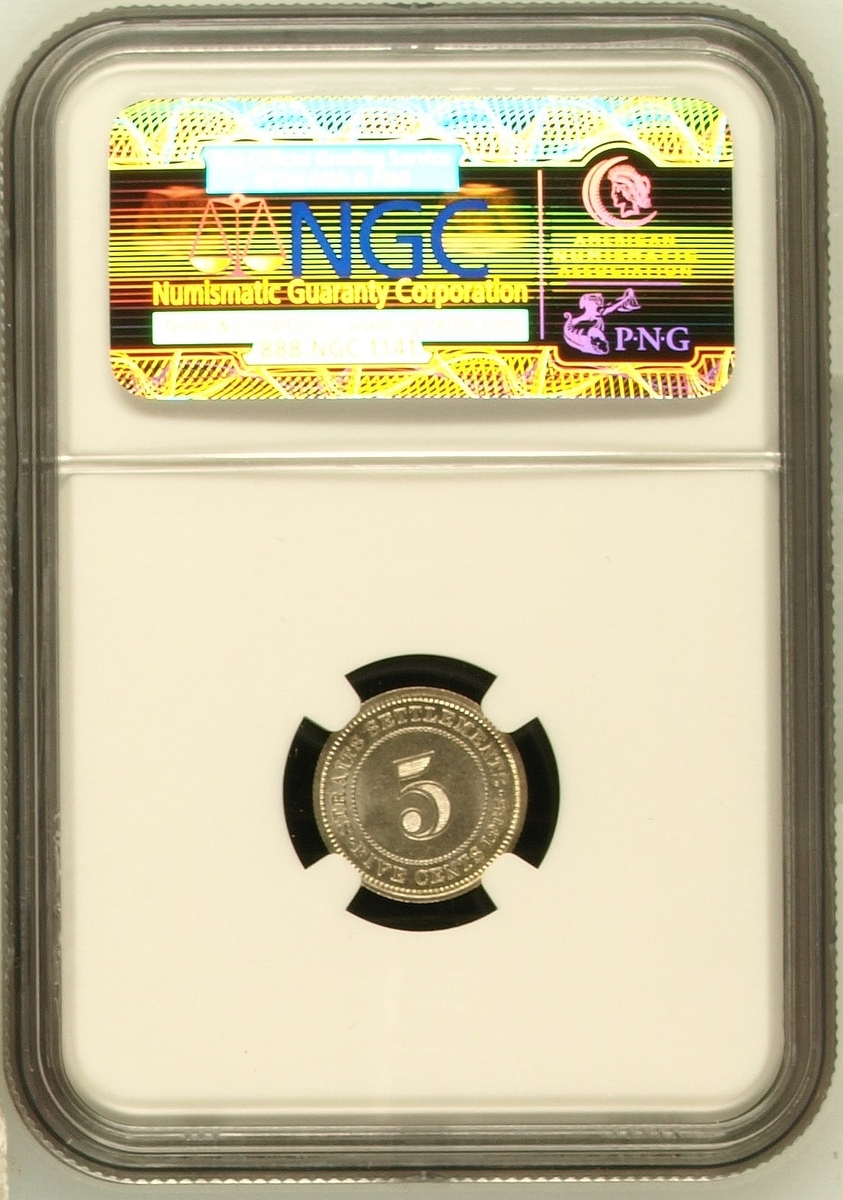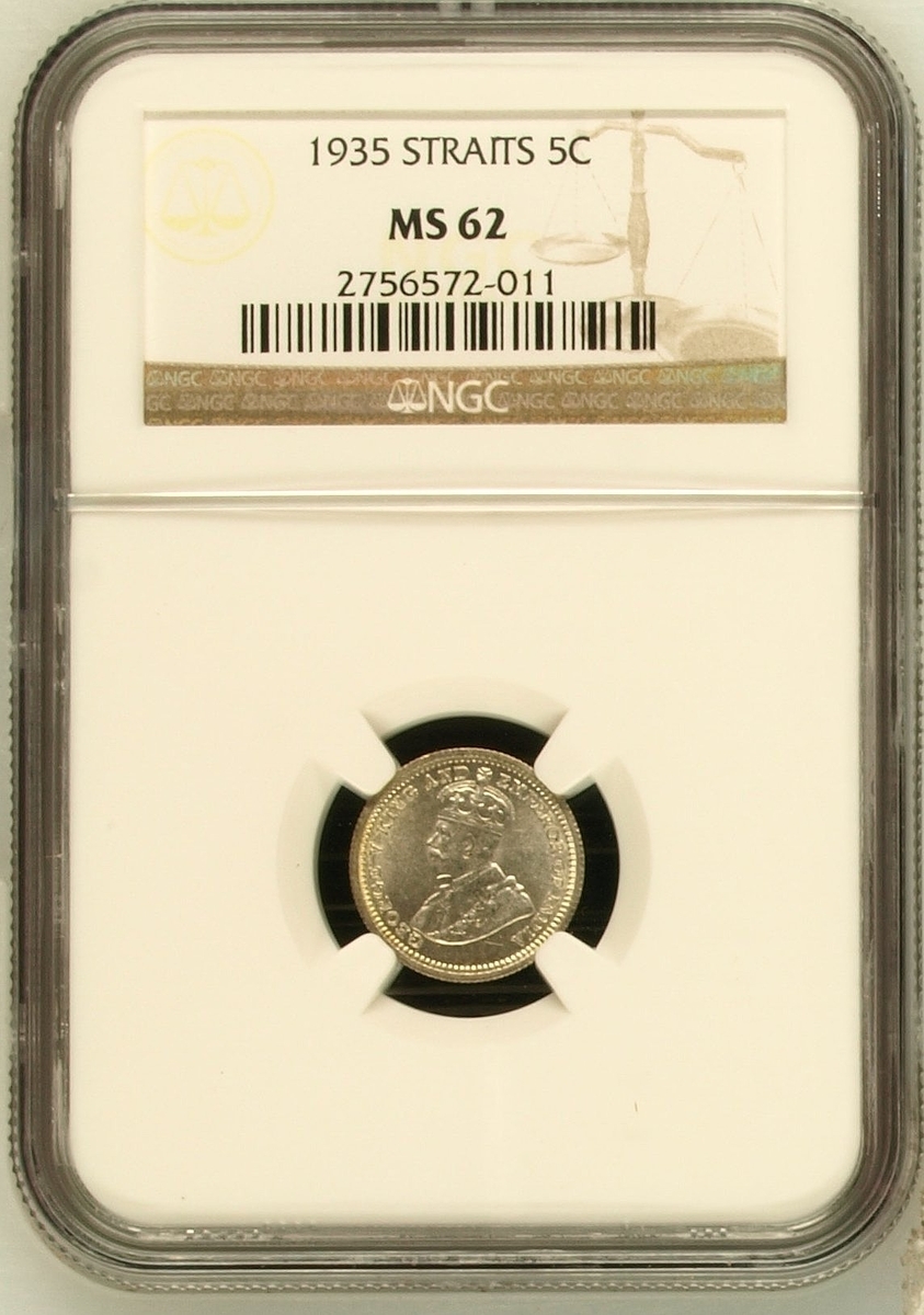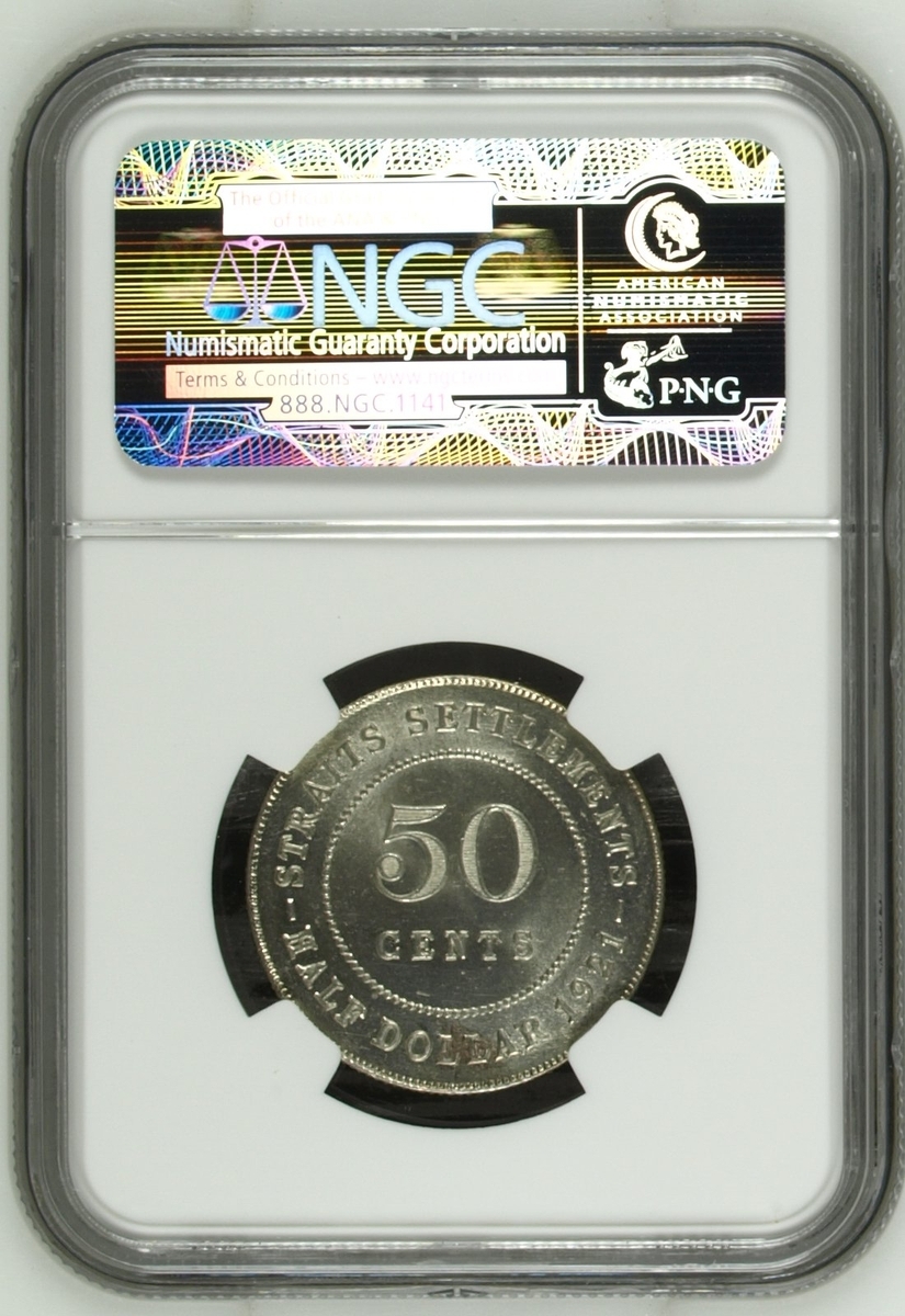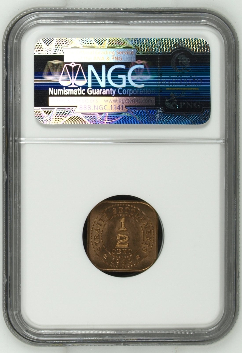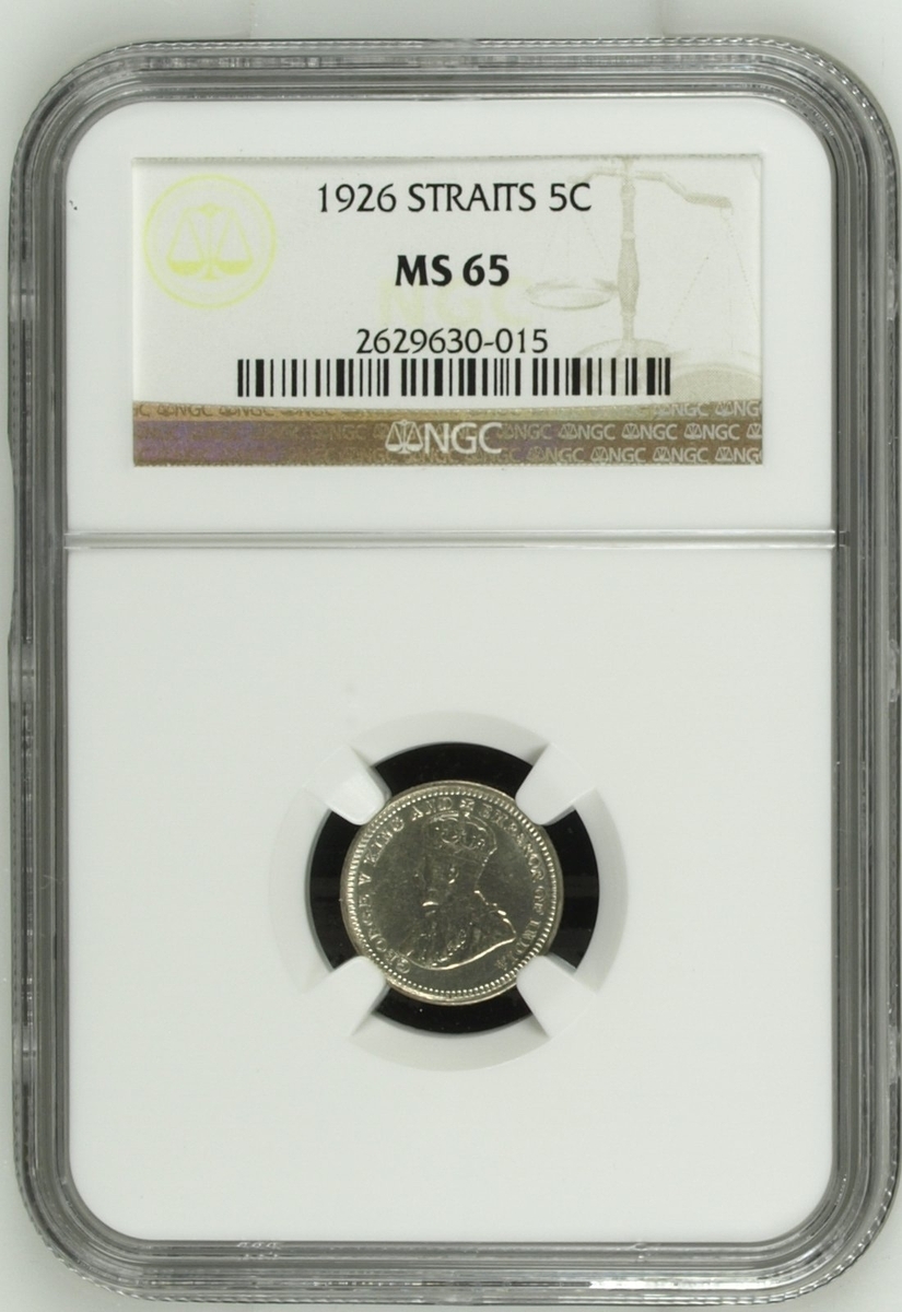 PCGS MS63 | Straits Settlements, George V (1910-1936), 50 Cents, 1920, without dot, crowned and draped bust left, rev. value, edge milled, 12h (KM 35.1), with irregular toning, otherwise with a pleasing lustre, extremely fine, in NGC holder, graded MS63 (Cert. #31061885); NGC MS65 | 50 Cents, 1921, crowned and draped bust left, rev. value, edge milled, 12h (KM 35.1), some wispy hairlines, otherwise with a pleasing cartwheel lustre, about uncirculated, in NGC holder, graded MS65 (Cert. #2629630-032); NGC MS65 | 50 Cents, 1921, crowned and draped bust left, rev. value, edge milled, 12h (KM 35.1), some wispy hairlines, otherwise with a pleasing cartwheel lustre, about uncirculated, in NGC holder, graded MS65 (Cert. #2630738-020); NGC MS65 | 5 Cents, 1926, crowned and draped bust left, rev. value, edge milled, 12h (KM 36), minor contact marks, with a pleasing lustre, extremely fine, in NGC holder, graded MS65 (Cert. #2629630-015); NGC MS62 | 5 Cents, 1935, crowned and draped bust left, rev. value, edge milled, 12h (KM 36), some minor contact marks, with a pleasing cartwheel lustre, extremely fine, in NGC holder, graded MS62 (Cert. #2756572-011); NGC MS64 RB | Half Cent, 1932, crowned and draped bust left, rev. value, edge plain, 12h (KM 37), with near full red surfaces, about uncirculated, in NGC holder, graded MS64 RB (Cert. #2636024-026) (6)