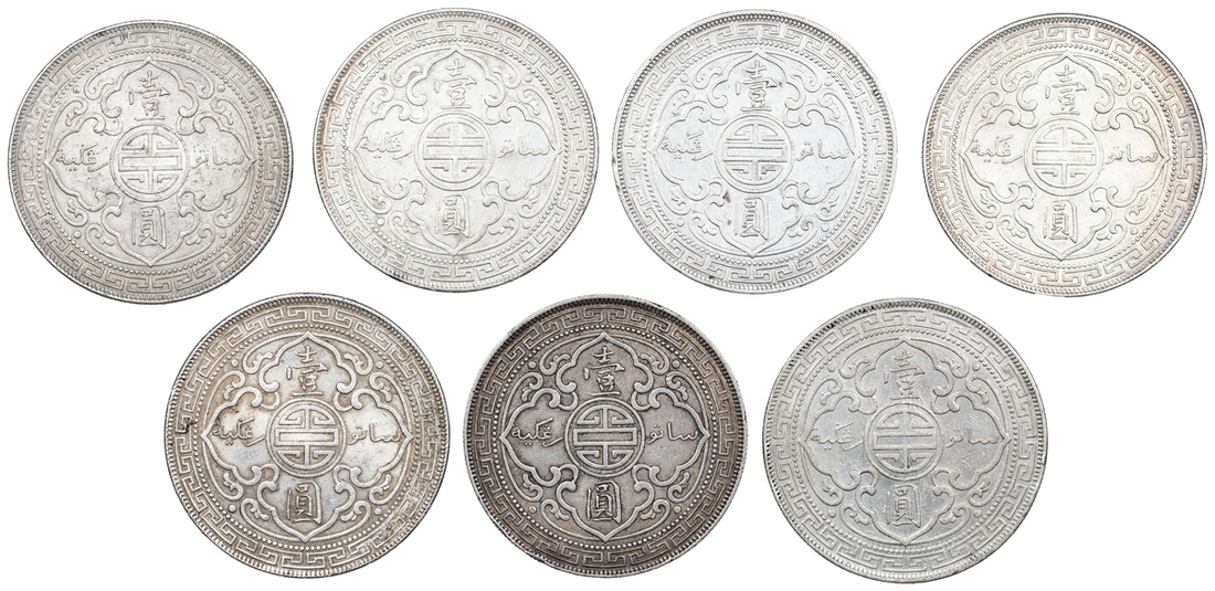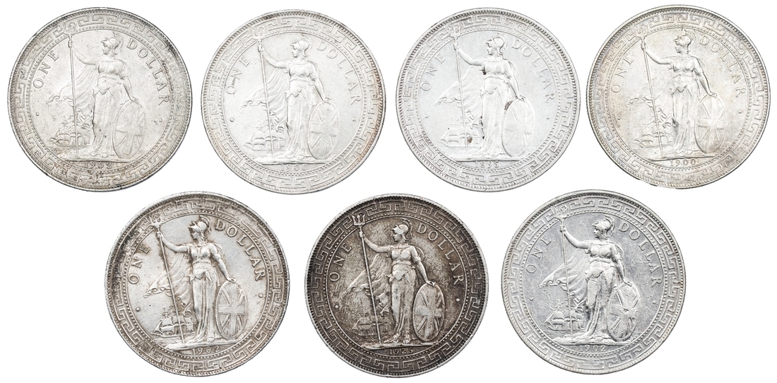 British Overseas Territories, Straits Settlements and Hong Kong (1895-1935), British Trade Dollar, 1895 B, Bombay Mint, by George William de Saulles, Britannia standing left, holding trident, cape billowing behind, date in exergue, rev. Chinese characters and Jawi script in ornamental flower, edge milled, 12h (Prid. 8; KM T5), heavily cleaned, very fine; another, British Trade Dollar, 1900 B, as before, edge milled, 12h (Prid. 8; KM T5), lightly bagmarked, with lustre, good very fine; another, British Trade Dollar, 1900 B, as before, edge milled, 12h (Prid. 8; KM T5), with some contact marks, yet lustrous, about extremely fine; British Trade Dollar, 1902 B, as before, edge milled, 12h (Prid. 8; KM T5), some minor surface marks to otherwise frosty-lustrous surfaces, about extremely fine; another, British Trade Dollar, 1900 B, as before, edge milled, 12h (Prid. 8; KM T5), wiped and lightly bagmarked, with lustre, very fine; another, British Trade Dollar, 1900 B, as before, edge milled, 12h (Prid. 8; KM T5), minor contact marks, toned to the peripheries, about extremely fine; another, British Trade Dollar, 1925, as before, edge milled, 12h (Prid. 25; KM T5), edge bruising and softness to higher points, very fine (7)
