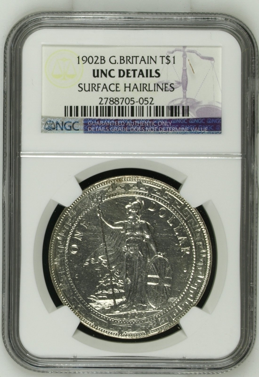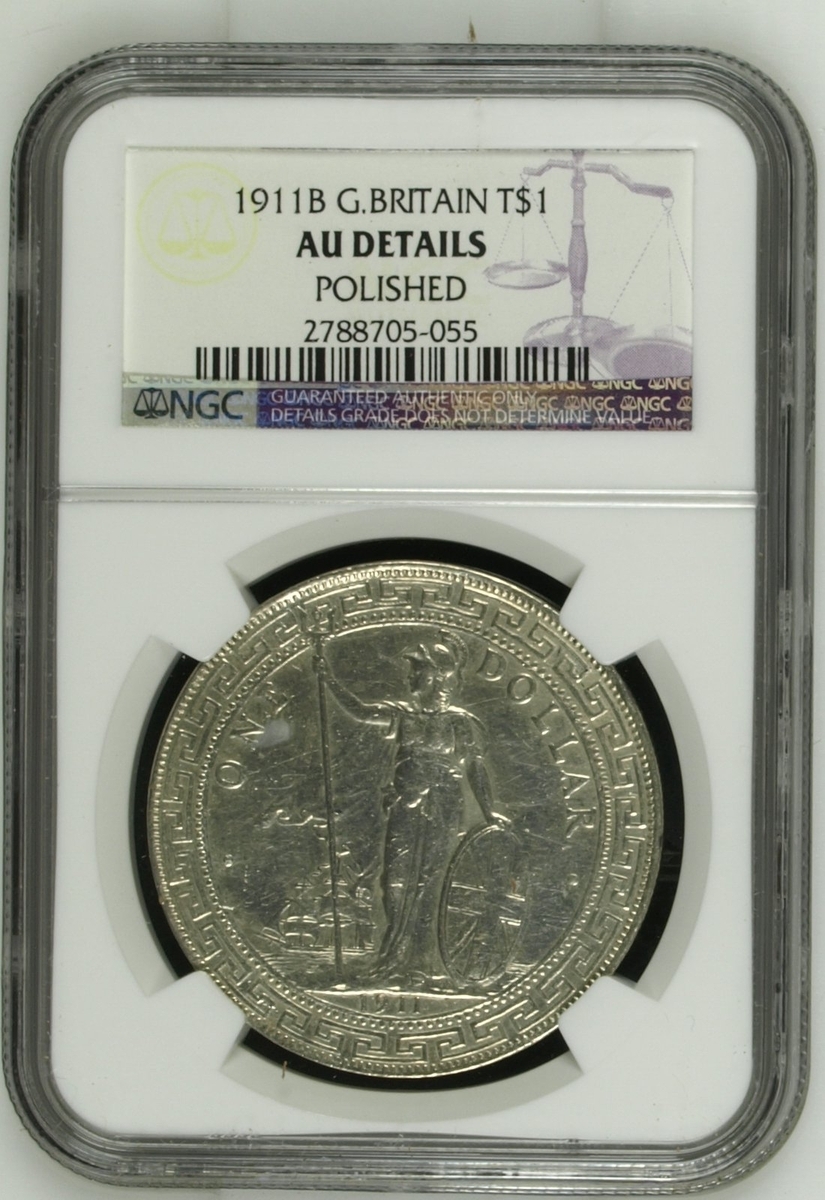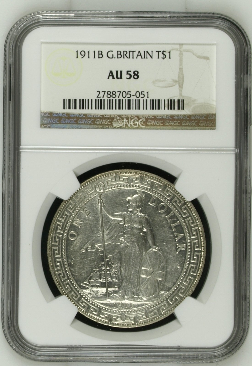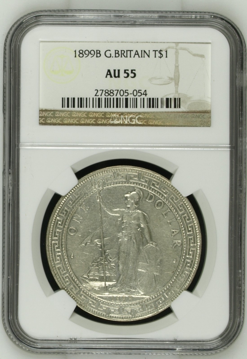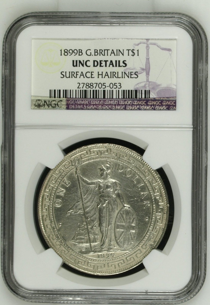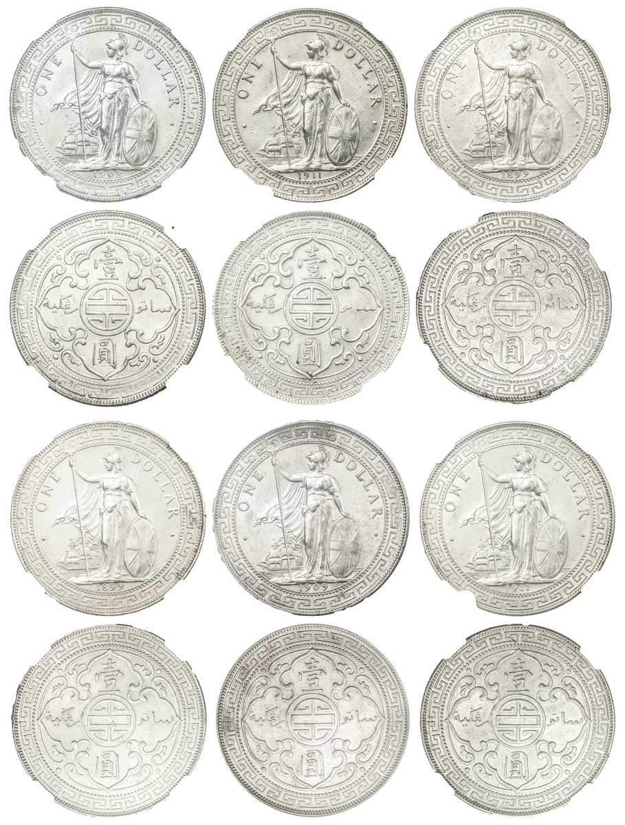 NGC UNC | British Overseas Territories, Straits Settlements and Hong Kong (1895-1935), British Trade Dollar, 1899 B, 'Large 99', Bombay Mint, by George William de Saulles, Britannia standing left, holding trident, cape billowing behind, date in exergue, rev. Chinese characters and Jawi script in ornamental flower, edge milled, 12h (Mars BTD1; Prid. 8; KM T5), heavily surface hairlined, yet residual lustre to reverse, extremely fine, in NGC holder, graded UNC DETAILS ~ Surface Hairlines (cERT. #2788705-053); NGC AU55 | British Trade Dollar, 1899 B, 'Large 99', Bombay Mint, by George William de Saulles, Britannia standing left, holding trident, cape billowing behind, date in exergue, rev. Chinese characters and Jawi script in ornamental flower, edge milled, 12h (Mars BTD1; Prid. 8; KM T5), bagmarked and worn in parts, with a hint of lustre to depths of fields, bolder very fine, in NGC holder, graded AU55 (Cert. #2788705-054); NGC UNC | British Trade Dollar, 1902 B, Bombay Mint, by George William de Saulles, Britannia standing left, holding trident, cape billowing behind, date in exergue, rev. Chinese characters and Jawi script in ornamental flower, edge milled, 12h (Mars BTD1; Prid. 13; KM T5), heavily hairlined and bright, yet residually lustrous, more so to reverse, about extremely fine, in NGC holder, graded UNC DETAILS ~ Surface Hairlines (Cert. #2788705-052); ANACS MS60 | British Trade Dollar, 1909 B, Bombay Mint, by George William de Saulles, Britannia standing left, holding trident, cape billowing behind, date in exergue, rev. Chinese characters and Jawi script in ornamental flower, edge milled, 12h (Mars BTD1; Prid. 19; KM T5), with some contact marks and hairlines, patchy toning otherwise lustrous, about extremely fine, in ANACS holder, graded MS60 DETAILS ~ Cleaned (Cert. #4976034); NGC AU58 | British Trade Dollar, 1911 B, 'Small 11', Bombay Mint, by George William de Saulles, Britannia standing left, holding trident, cape billowing behind, date in exergue, rev. Chinese characters and Jawi script in ornamental flower, edge milled, 12h (Mars BTD1; Prid. 21; KM T5), hairlined and with softness to the tops of devices, nonetheless lustrous, more so to the reverse, extremely fine, in NGC holder, graded AU58 (Cert. #2788705-051); NGC AU | British Trade Dollar, 1911 B, 'Small 11', Bombay Mint, by George William de Saulles, Britannia standing left, holding trident, cape billowing behind, date in exergue, rev. Chinese characters and Jawi script in ornamental flower, edge milled, 12h (Mars BTD1; Prid. 21; KM T5), heavily cleaned and with contact marks, bolder very fine, in NGC holder, graded AU DETAILS ~ Polished (Cert. #2788705-055) (6)