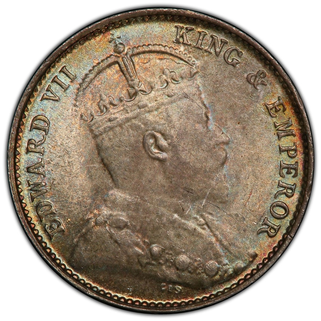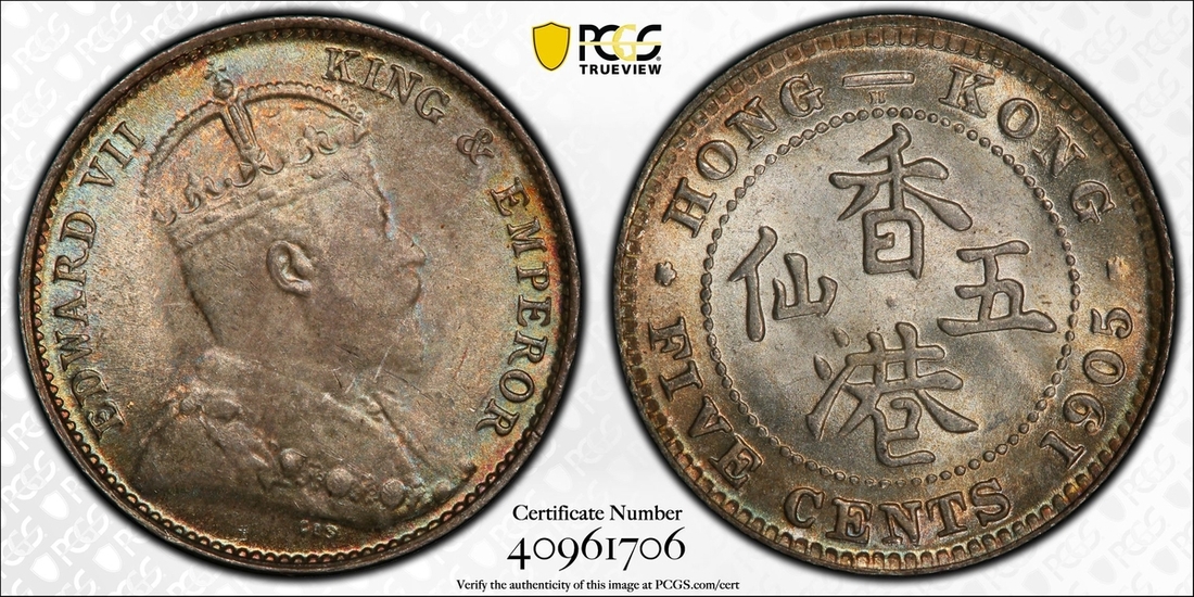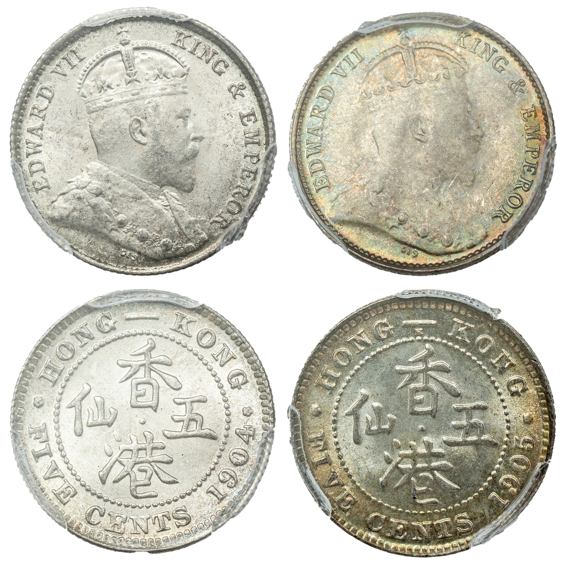 PCGS MS65 | Hong Kong, Edward VII (1901-1910), 5 Cents, 1905 H, crowned and draped bust right, rev. symbols within border, edge milled, 11h (KM 12), toned and lustrous, extremely fine, in PCGS holder, graded MS65 (Cert. #40961706); another, PCGS MS64 | 5 Cents, 1904, crowned and draped bust right, rev. symbols within border, edge milled, 12h (KM 12), with a handsome lustre, extremely fine, in PCGS holder, graded MS64 (Cert. #40961698) (2)