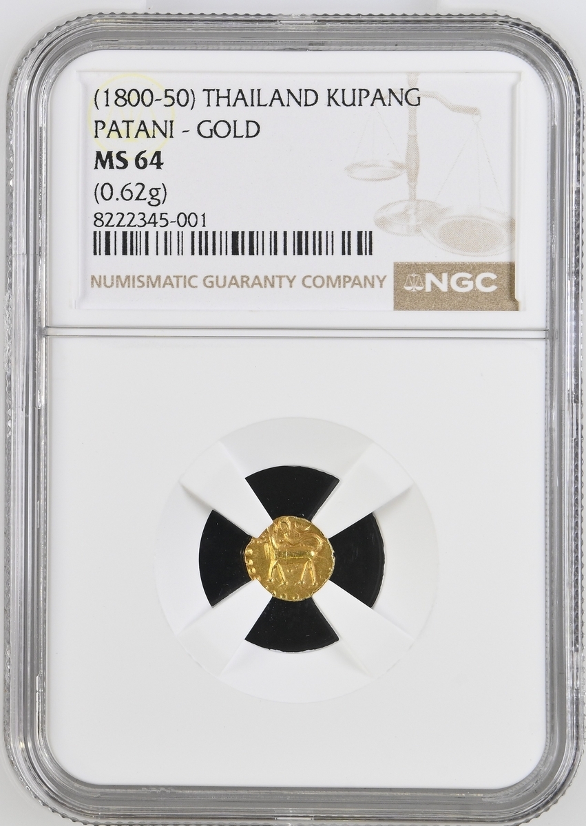 (g) NGC MS64 | *Top Pop* | Thailand, Patani-Kelantan (1800-1850), Kupang, undated, the Malaysian Barking deer (Kijang) walking left, rev. Arabic inscription "al-Adil" (the Just), both within beaded border, 0.62g, 6h (KM 51; SS.57), well-centred and with a pleasing lustre, extremely fine, in NGC holder, graded MS64 *Top Pop* [Joint Finest Certified] (Cert. #8222345-001)