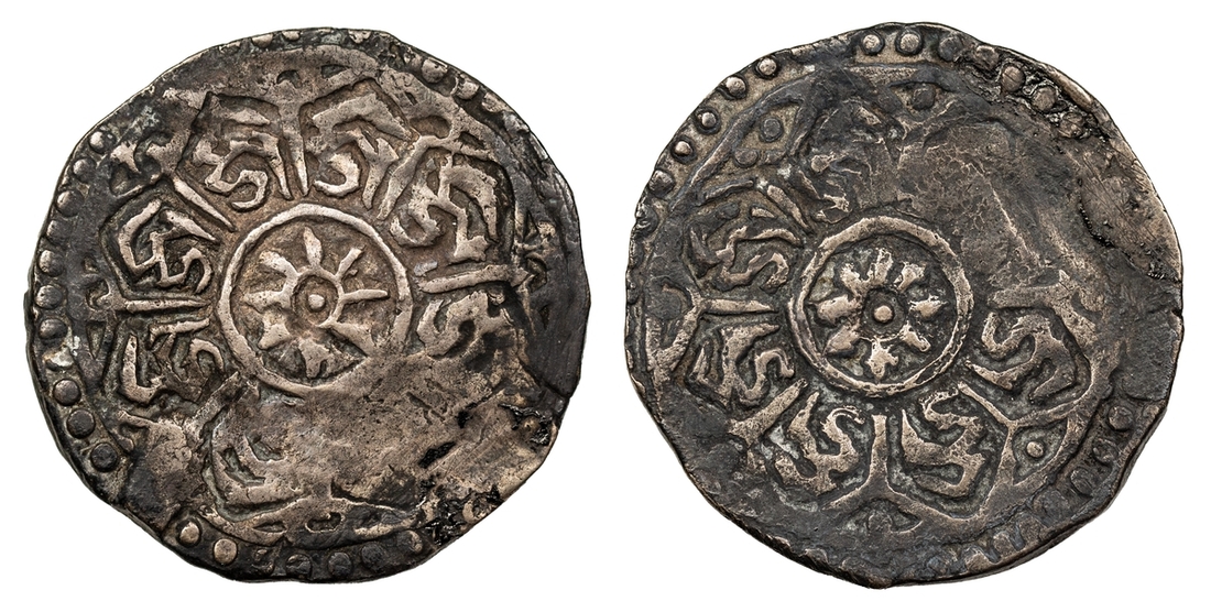 On both sides the inscription represents eight times the syllable "dza" in Vartula-script (equivalent to the syllable "ja" in Sanskrit). "ja" may be short for jaya (victorious). Together with the wheel with eight spokes in the centre the meaning would be "victorious wheel", referring to the teaching of the Buddha or more specifically to the dharma cakra (Tibetan chos 'khor), the wheel of religion which according to Buddhist tradition was set in motion by Buddha in the deer park of Sarnath, near Varanasi (Benares). Chinese sources report that the first coins were struck in Tibet in 1763/4 and in 1785 and this coin has been been tentatively attributed to the years 1763/4, 1785 or to the early 19th century (Martynov, A. S.: "O pervych chekankakh monety v Tibete" Kratkie Soobshcheniia Akademia Nauk SSSR, Institut Narodoz Azji, no. 69, Moscow, 1965, p. 197-202).