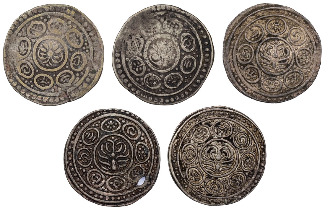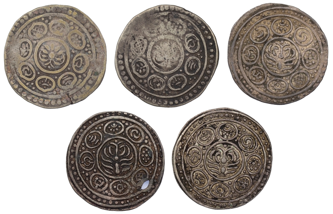 Tibetan and Chinese Authority, Anonymous, 'Kong-Par' Tangka, 13-46 (1792) (2), struck c.1860, (KM C60.3); another, 15-24 (1890) (2), both single circle around lotus, (KM CA13.1); another, 15-25 (1891), (KM CA13.1), both 1792 examples fine, the others with deposits to fields, otherwise very fine (5)