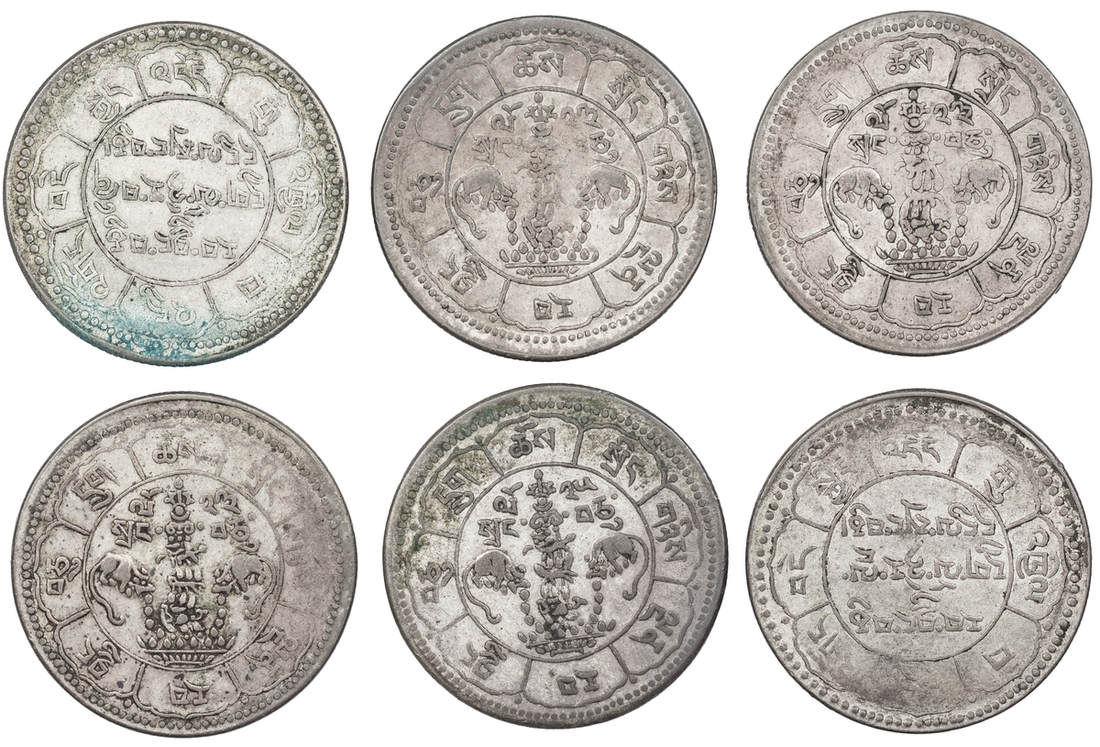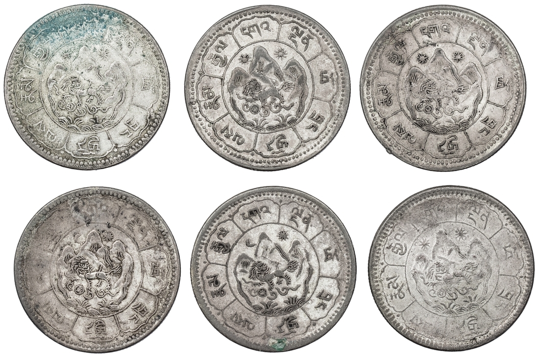 Tibetan Government, Anonymous, 10-Srang, BE16-23 (1949) (3), two suns, edges milled, 12h (KM Y29.1); another, 10-Srang, BE16-24 (1950), two suns, edge milled, 12h (KM Y30); another, 10-Srang, BE16-25 (1951), edge milled, 12h (KM Y30); another, 10-Srang, BE16-25 (1951), sun and moon, edge milled, 12h (KM Y29a), all worn and with some spots of verdigris, fine to about very fine, including regular government issues and those issued to pay Tibetan army members (6)