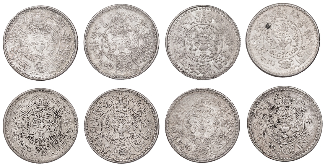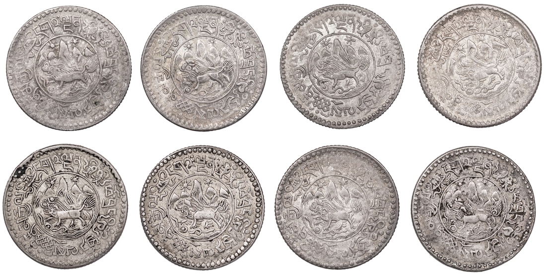 Tibetan Government, Anonymous, 1 and Half-Srang (2), BE16-10 (1936), edges milled, 12h; 2h (KM Y24); 1 and Half-Srang (3), BE16-11 (1937), edges milled, 5h; 12h; 12h (KM Y24); 1 and Half-Srang (3), BE16-12 (1938), edges milled, 1h; 12h; 11h (KM Y24), generally very fine or better (8)