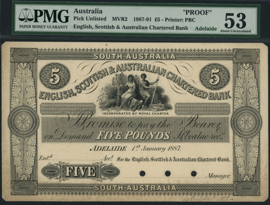 (x) English, Scottish & Australian Chartered Bank, South Australia, proof 5 Pounds, Adelaide, 1st January 1887, (Pick Unlisted), in PMG holder 53 About Uncirculated, printer's annotations, stains