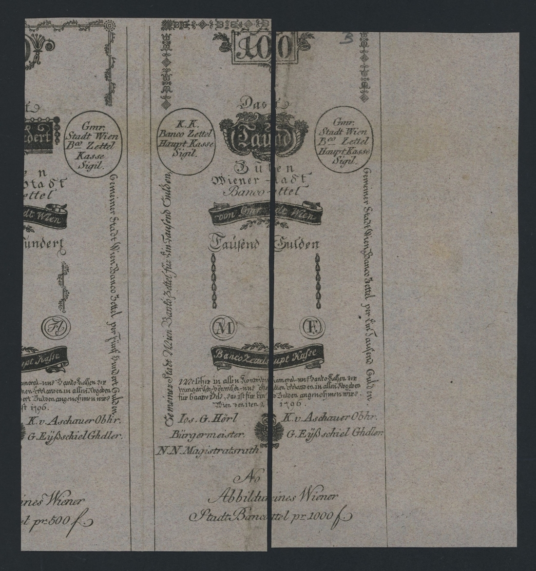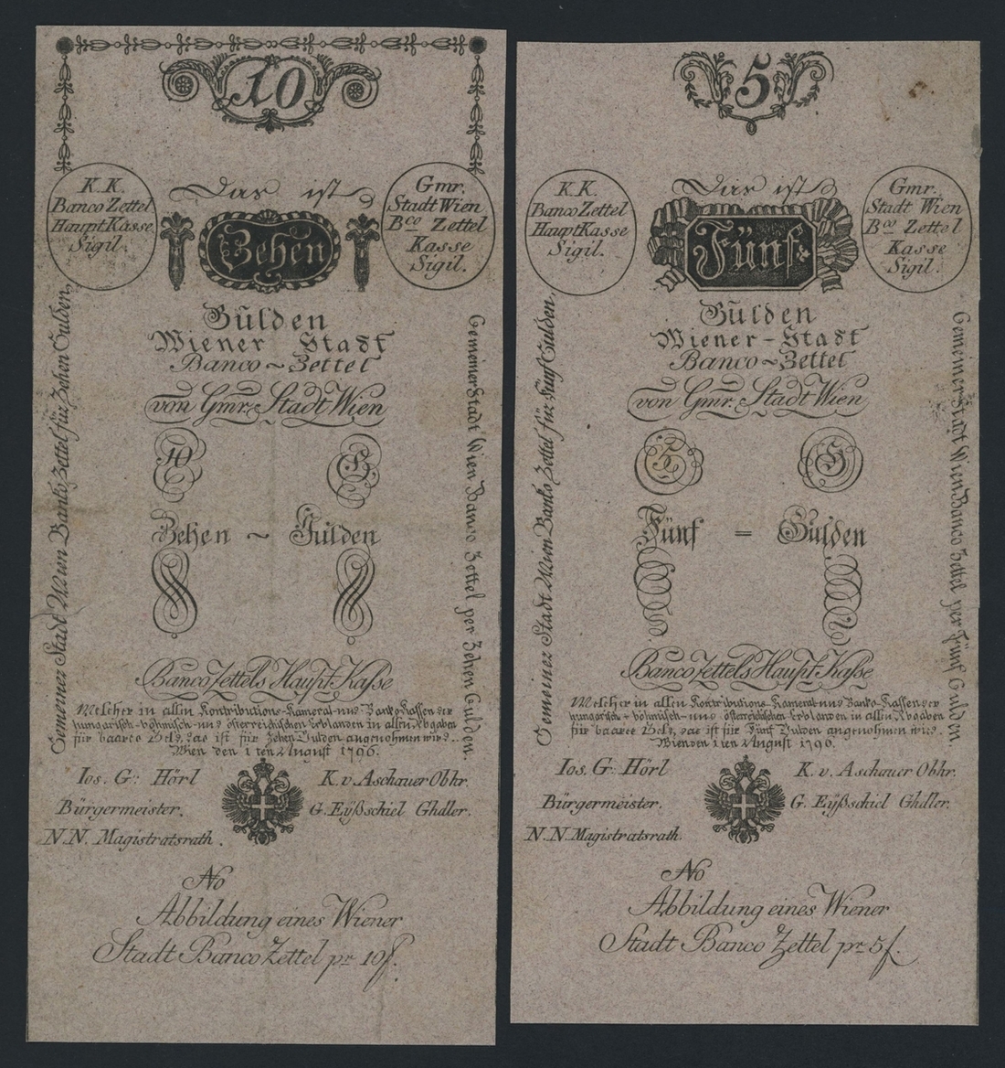 [2 notes] Wiener Stadt-Banco, Austria, 5 Gulden, 10 Gulden, 1st August 1796, "Formulare", (Pick A22a, A23a), near extremely fine