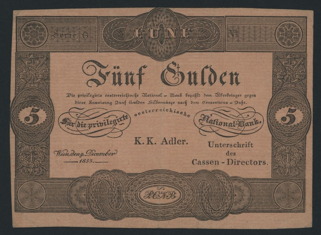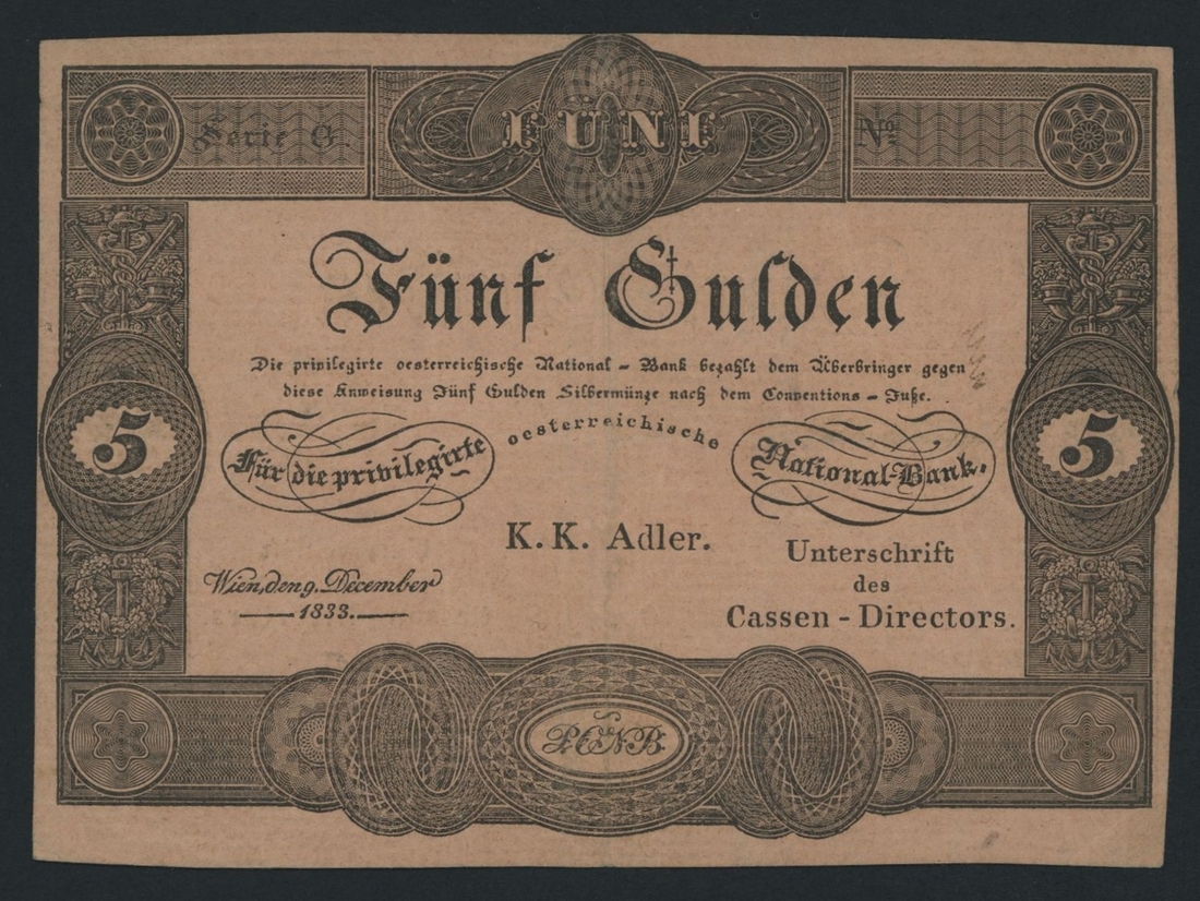 Austrian National Bank, 5 Gulden, 9th December 1833 issue, (Pick A68), good very fine