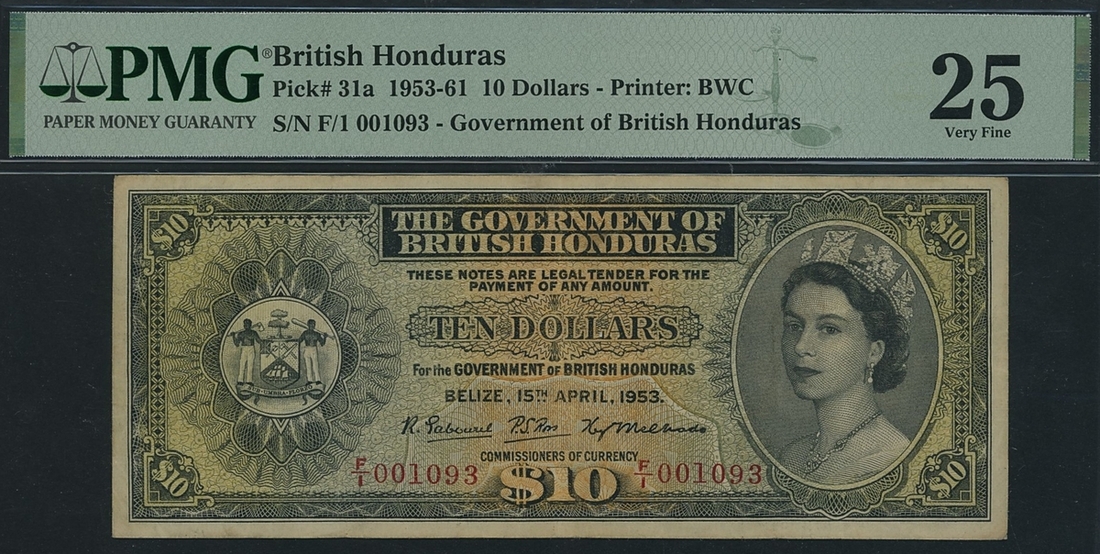 (x) Government of British Honduras, 10 Dollars, 15th April 1953, serial number F/1 001093, (Pick 31a, BNB 130a) in PMG holder 25 Very Fine