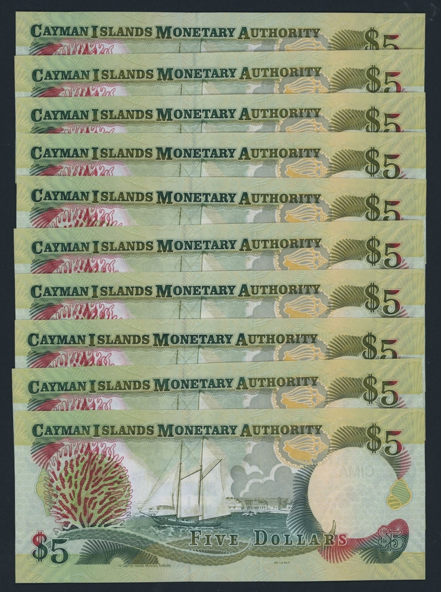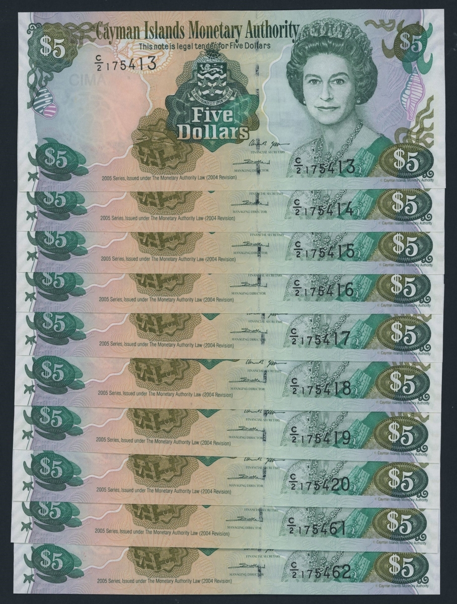 (x) Cayman Islands Monetary Authority, [10 notes], consecutive $5, 2005, consecutive serial numbers C/2 175413-20 and C/2 175461, 62,