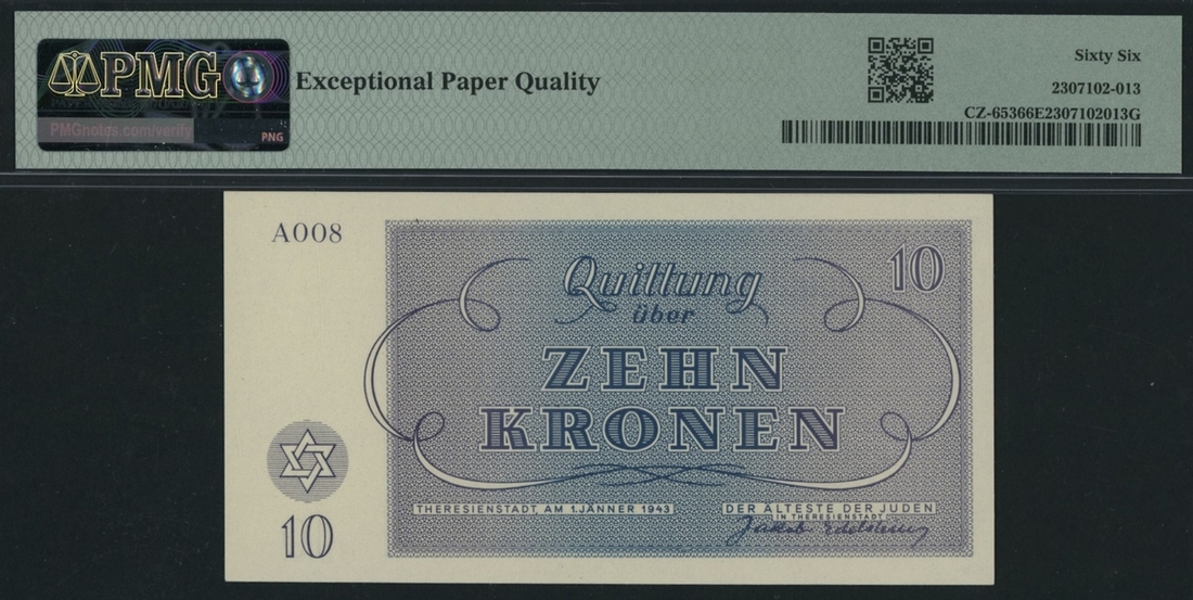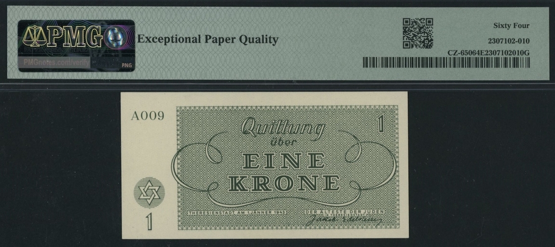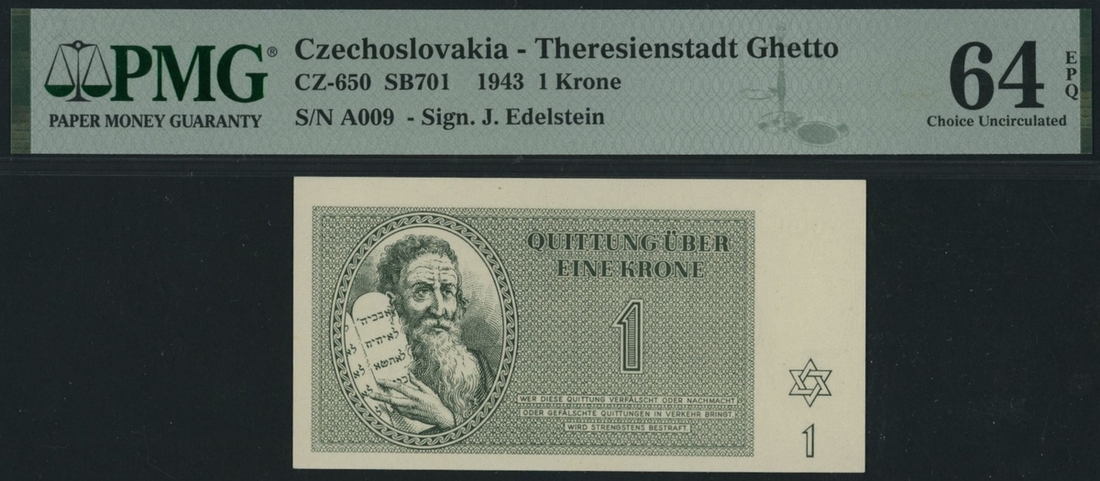 (x) Czechoslovakia - Theresienstadt Ghetto 1, 2, 5, 10, 20, Krone(n), 1943, SN A009, A001, A007, A008, B 022337, H 021456, B 021311, (Feller CZ650-656, Schwan-Boling 701-707), in PMG holders 64EPQ, 66EPQ, 66EPQ, 66EPQ, 66EPQ, 66EPQ, 62EPQ, 20, 50, 100 Kroner watermarked (7 notes)