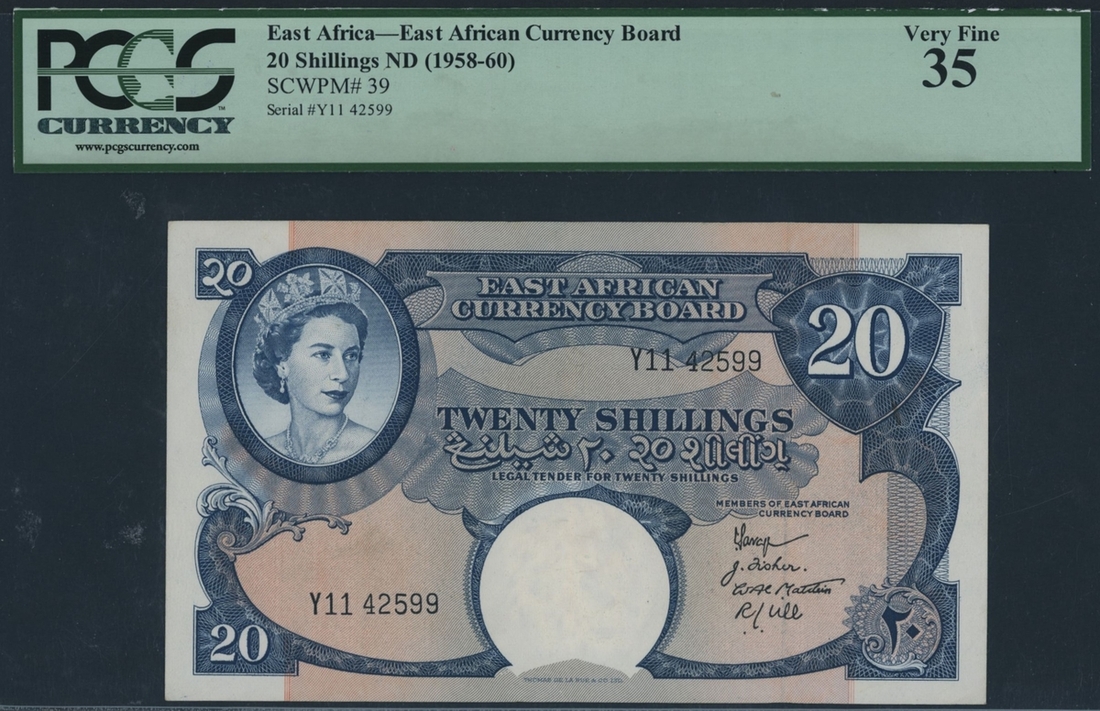 (x) East African Currency Board, 20 Shillings, ND (1958-60), serial number Y11 42599, (Pick 39, BNB 229), in PCGS holder 35 Very Fine