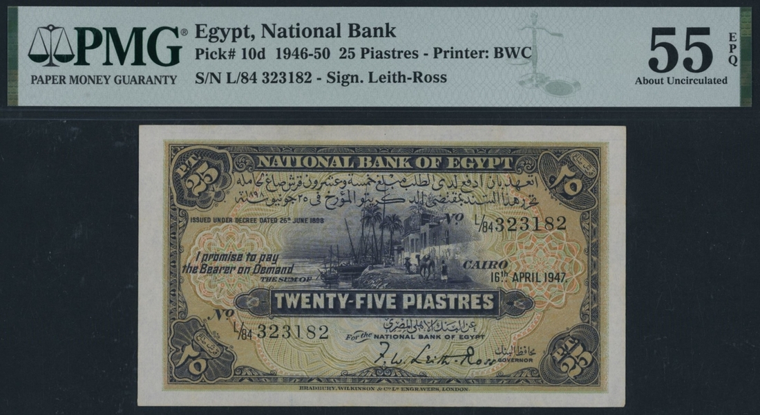 (x) National Bank of Egypt, 25 Piastres, Cairo, 16th April 1947, serial number L/84 323182, (Pick 10d, BNB 108), in PMG holder 55 EPQ About Uncirculated