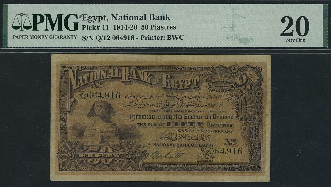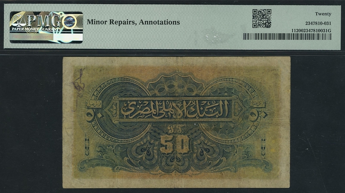 (x) National Bank of Egypt, 50 Piastres, 1914-20, serial number Q/12 064916, (Pick 11, BNB 109a) in PMG holder 20 Very Fine, minor repairs, annotations