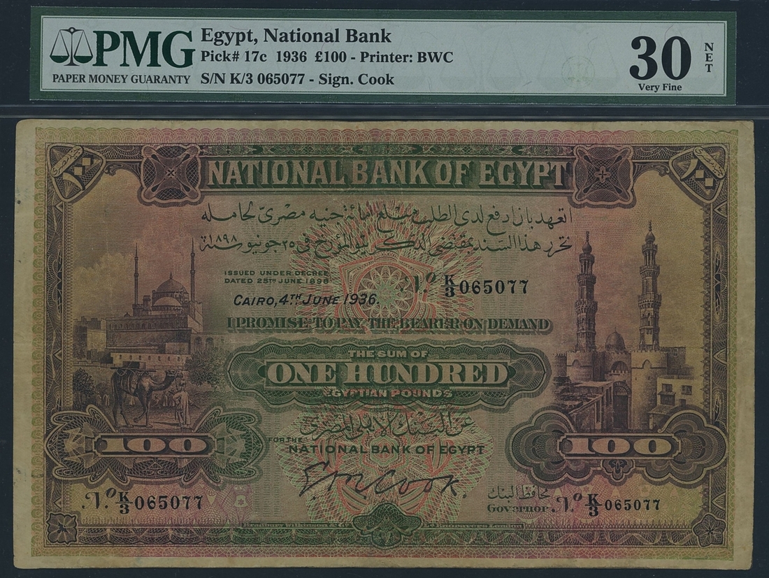 (x) National Bank of Egypt, £100, 1936, serial number K/3 065077, signature Cook,