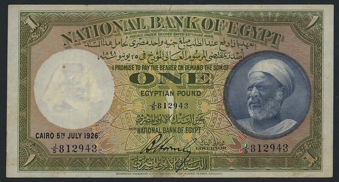 (x) National Bank of Egypt, 1 Egyptian Pound, Cairo, 5th July 1926, serial number J/5 812943, (Pick 20, BNB 119), very fine