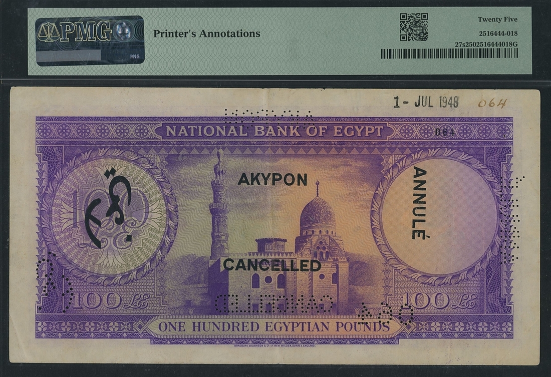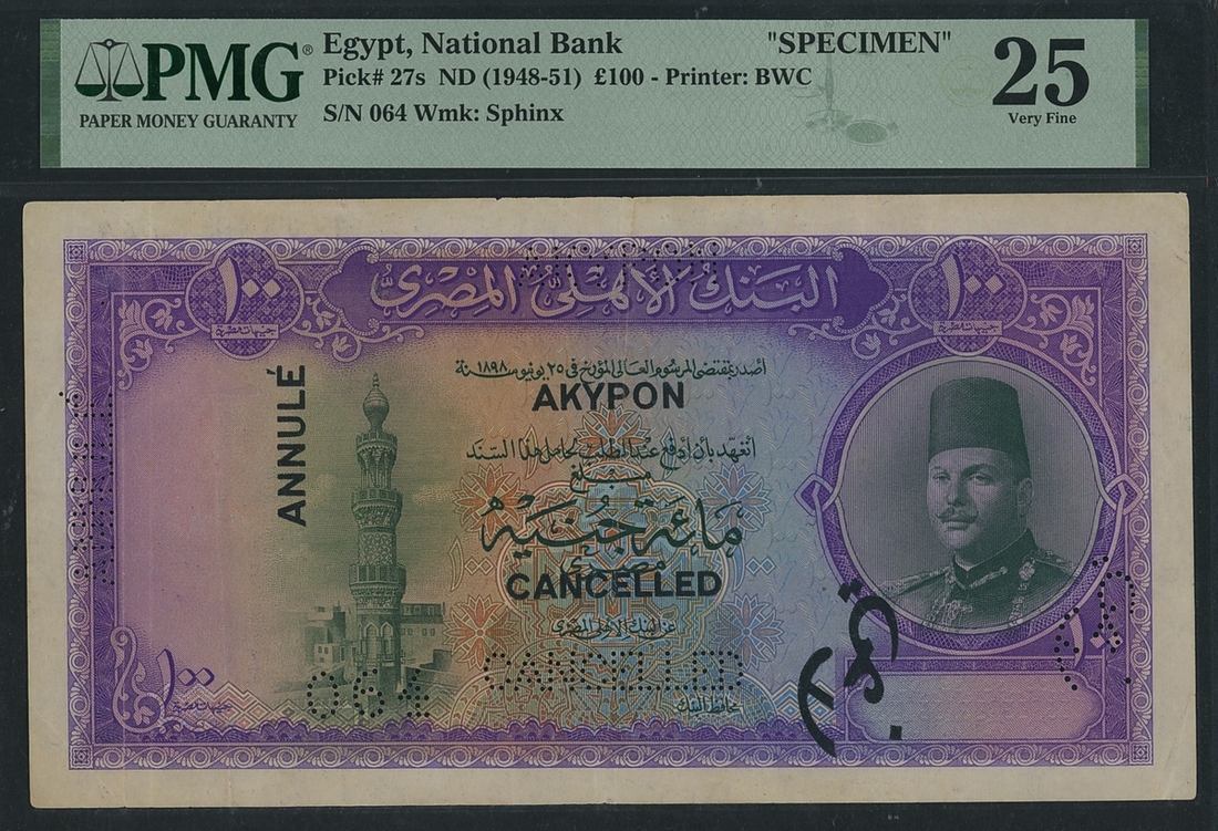 (x) Egypt, National Bank, specimen £100, ND (1948-51), serial number 064, cancelled, perforated,