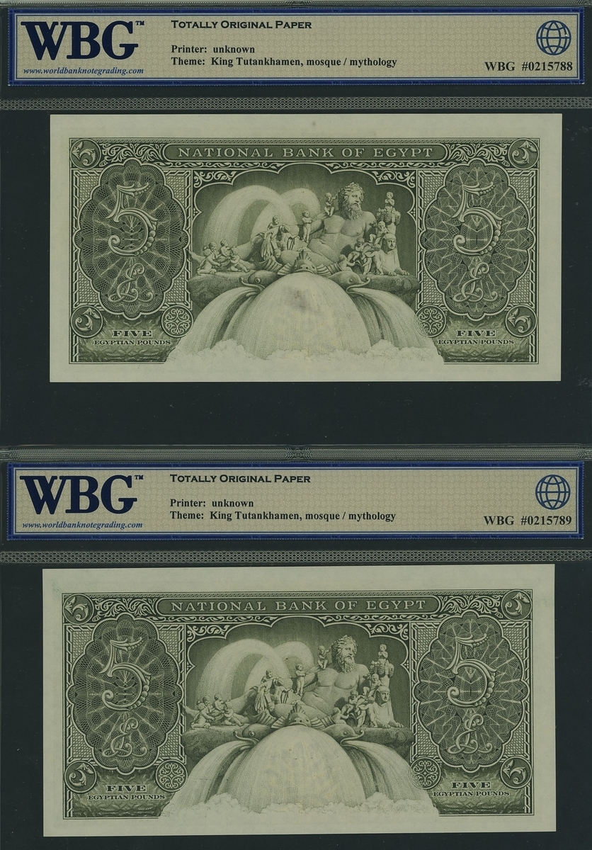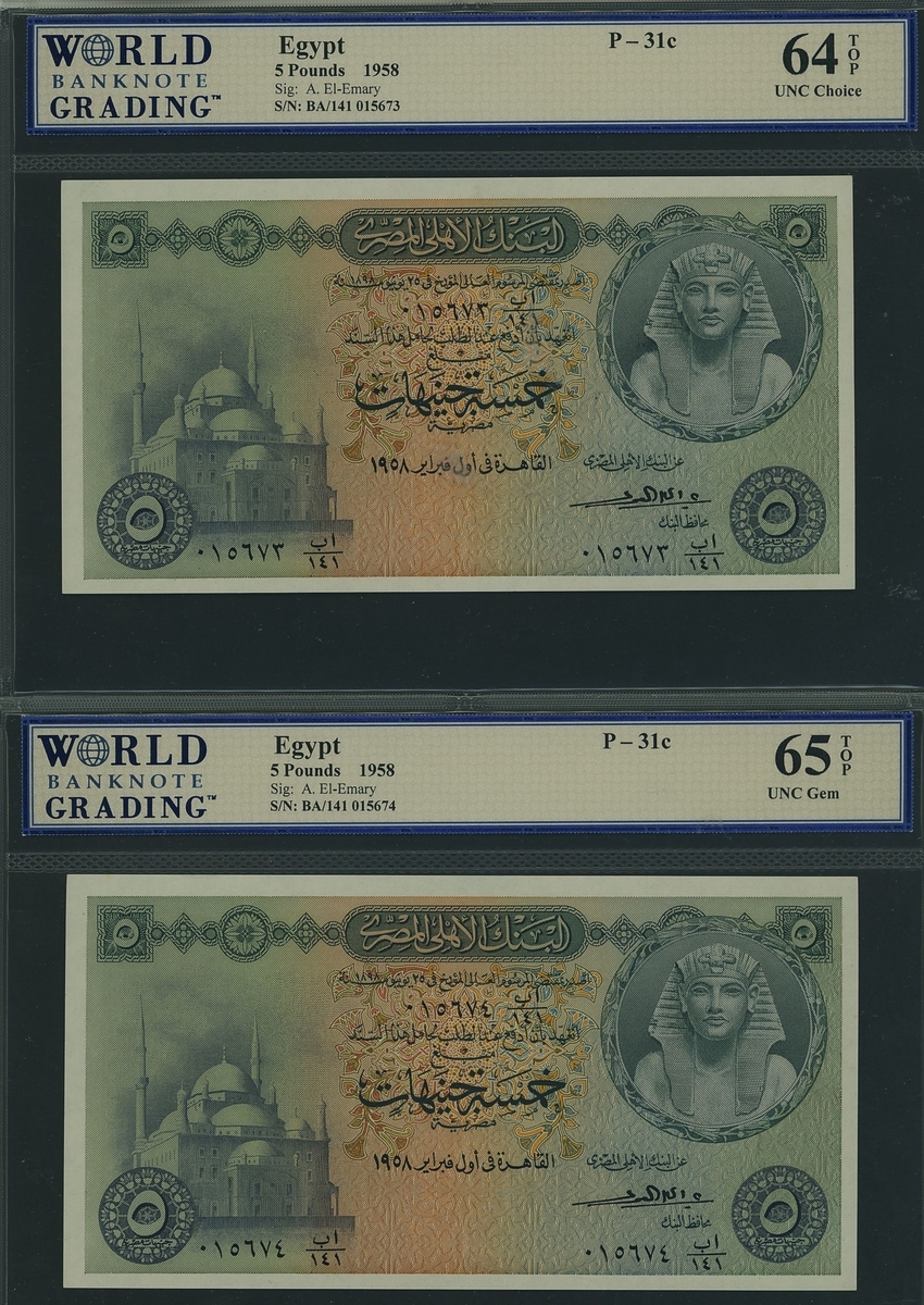 (x) National Bank of Egypt, [2 notes] £5, 1958, consecutive serial numbers BA/141 015673-4, (Pick 31c, BNB 131), in WBG holders 64 TOP UNC Choice, 65 TOP Uncirculated Gem (2 notes)