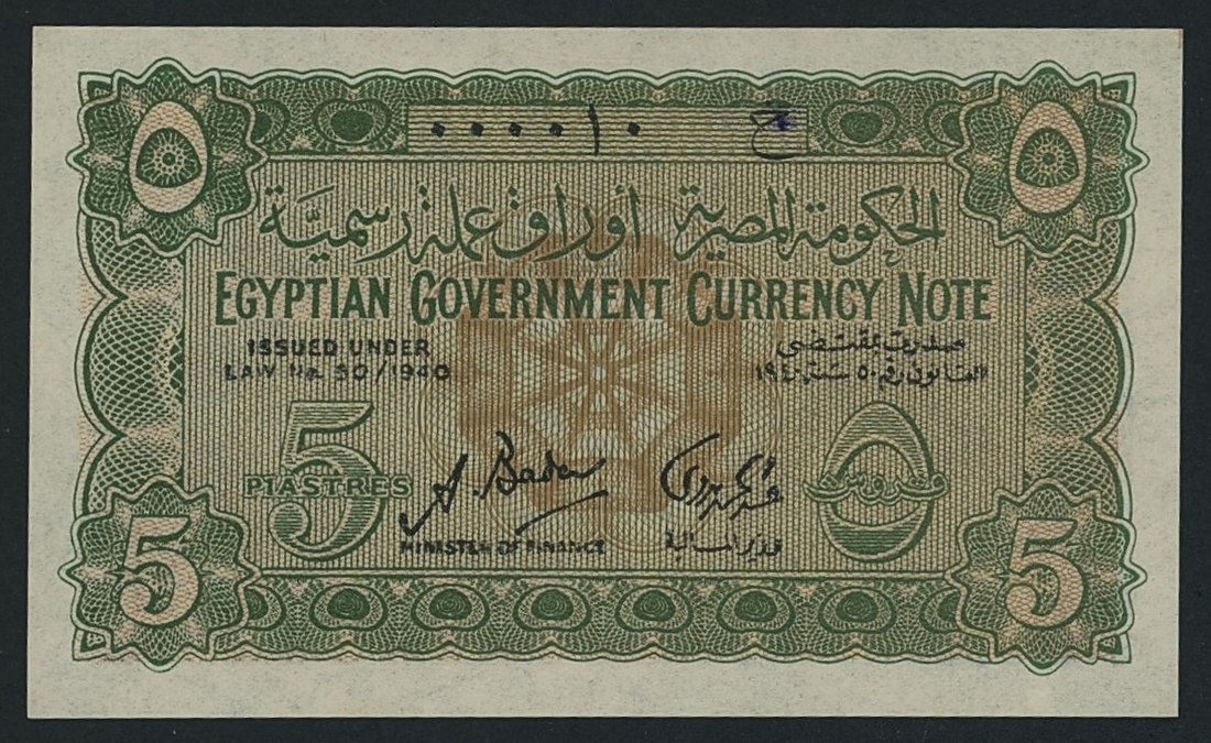 Government of Egypt, 5 Piastres, 1940, serial number 000010 G, very low, binary serial number,