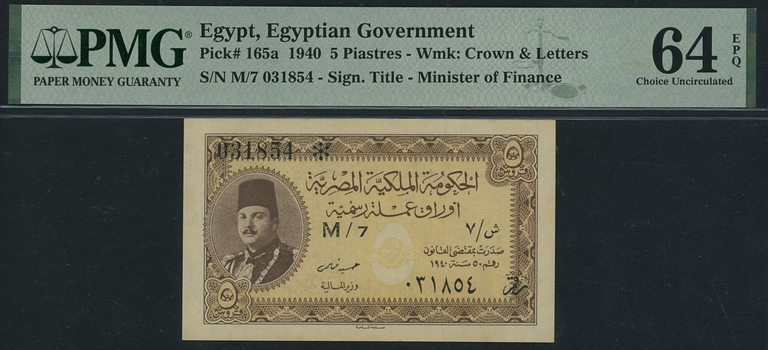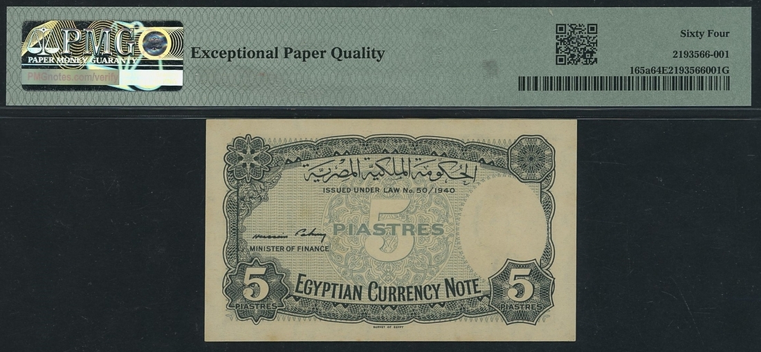 (x) Egyptian Government, 5 Piastres, 1940, serial number M/7 031854, signature Fahmy,
