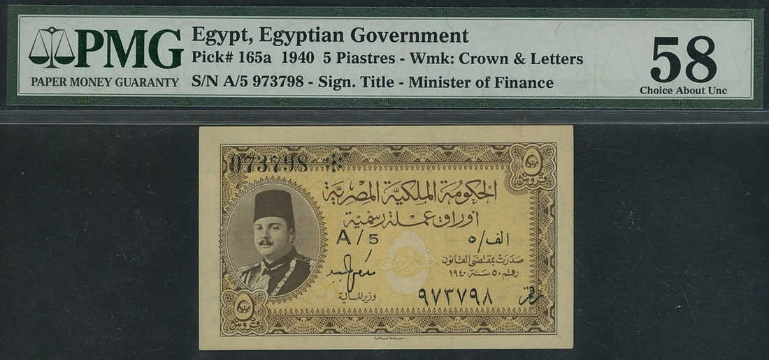 (x) Egyptian Government, 5 Piastres, 1940, serial number A/5 973798, signature Ebeid,