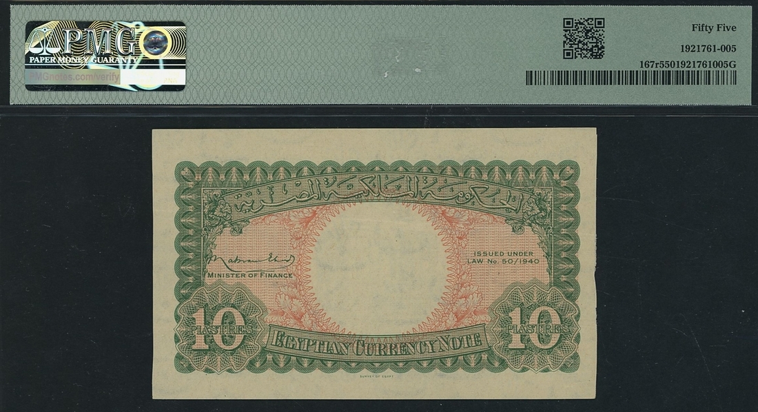 (x) Egyptian Government, Remainder 10 Piastres, 1940, (Pick 167r, BNB 211r) in PMG holder 55 About Uncirculated
