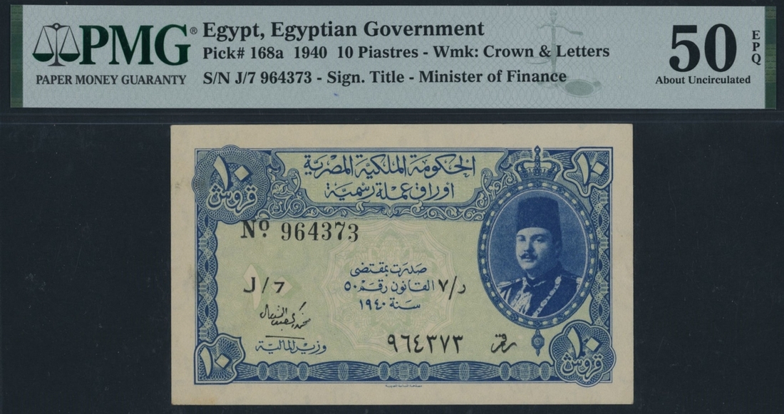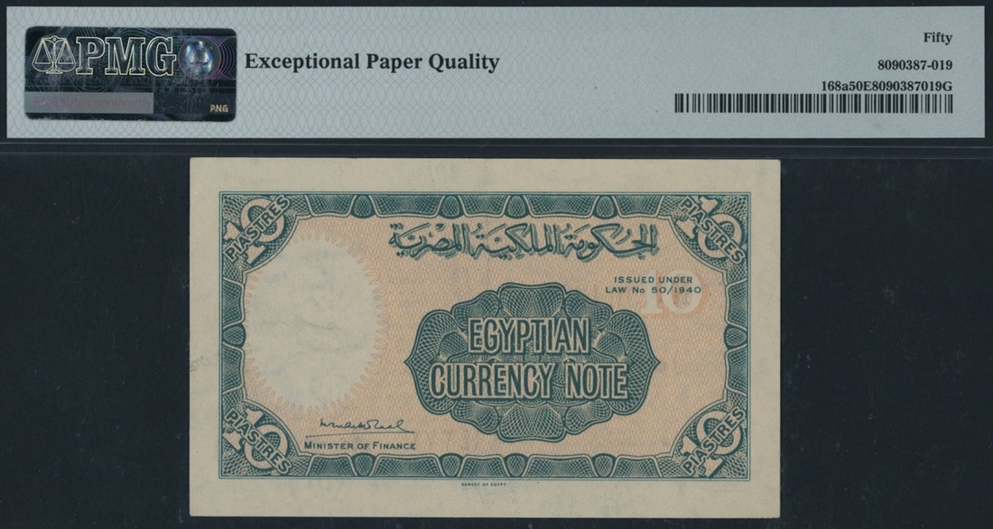 (x) National Bank of Egypt, 10 Piastres, Cairo, 1940, serial number J/7 964373, (Pick 168a, BNB 213), in PMG holder 50 EPQ About Uncirculated